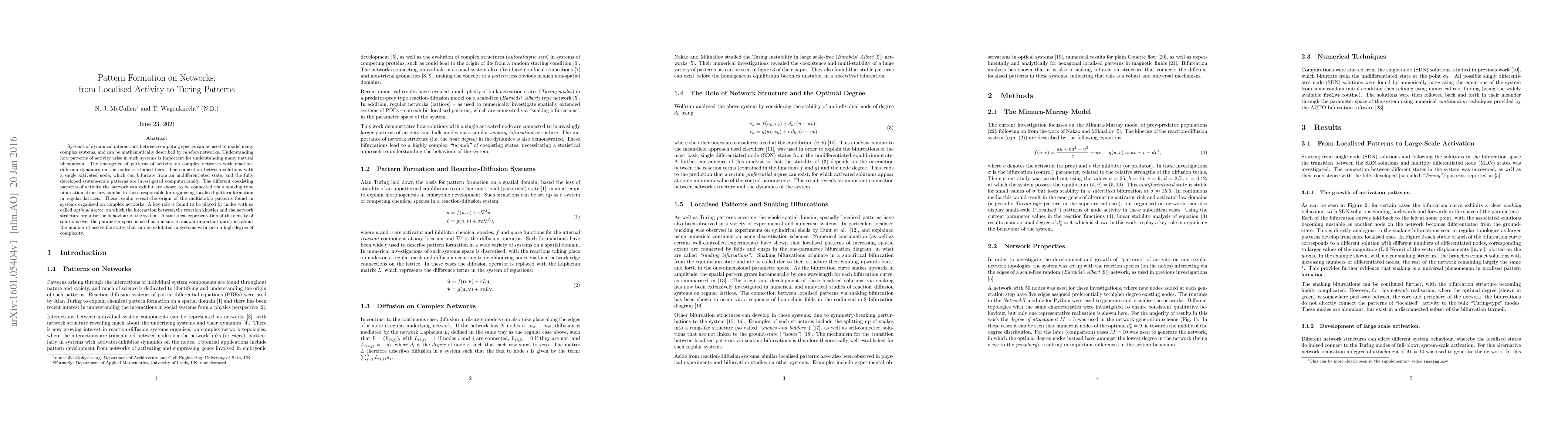 This paper investigates the emergence of activity patterns on complex networks through reaction-diffusion dynamics, revealing the connection between localised activity and system-scale patterns via bifurcation structures. It highlights the role of nodes with optimal degree in organising these patterns and uses statistical methods to explore the number of accessible states in such complex systems.
