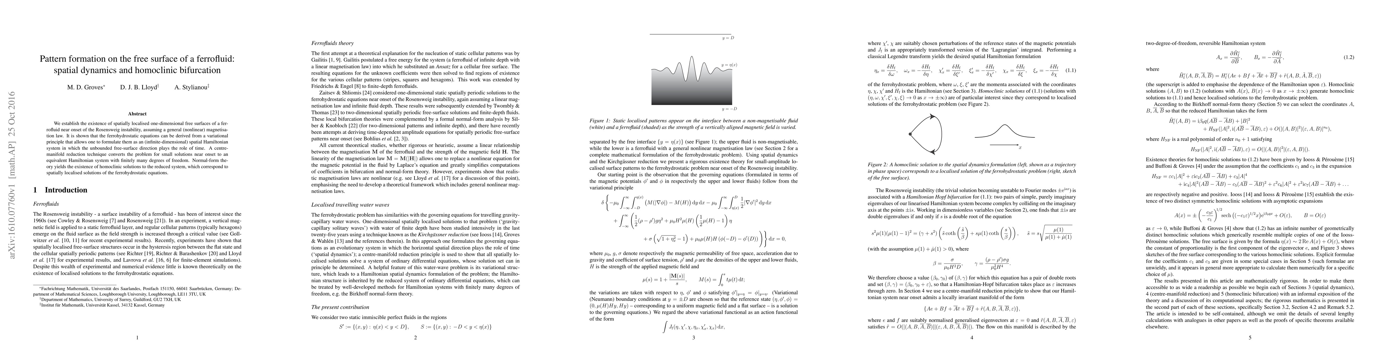 This paper investigates the spatial dynamics and homoclinic bifurcation in ferrofluids near the onset of Rosensweig instability, revealing localised one-dimensional free surfaces. It employs a variational principle to derive ferrohydrostatic equations as a Hamiltonian system, using centre-manifold reduction and normal-form theory to identify homoclinic solutions.