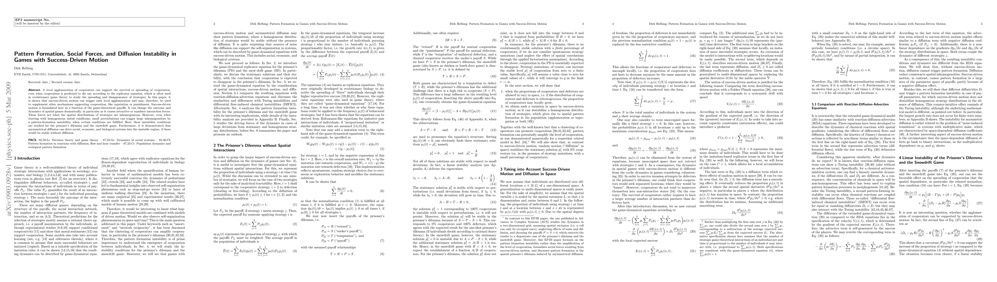 A local agglomeration of cooperators can support the survival or spreading of cooperation, even when cooperation is predicted to die out according to the replicator equation, which is often used in evolutionary game theory to study the spreading and disappearance of strategies. In this paper, it is shown that success-driven motion can trigger such local agglomeration and may, therefore, be used to supplement other mechanisms supporting cooperation, like reputation or punishment. Success-driven motion is formulated here as a function of the game-theoretical payoffs. It can change the outcome and dynamics of spatial games dramatically, in particular as it causes attractive or repulsive interaction forces. These forces act when the spatial distributions of strategies are inhomogeneous. However, even when starting with homogeneous initial conditions, small perturbations can trigger large inhomogeneities by a pattern-formation instability, when certain conditions are fulfilled. Here, these instability conditions are studied for the prisoner's dilemma and the snowdrift game. Furthermore, it is demonstrated that asymmetrical diffusion can drive social, economic, and biological systems into the unstable regime, if these would be stable without diffusion.