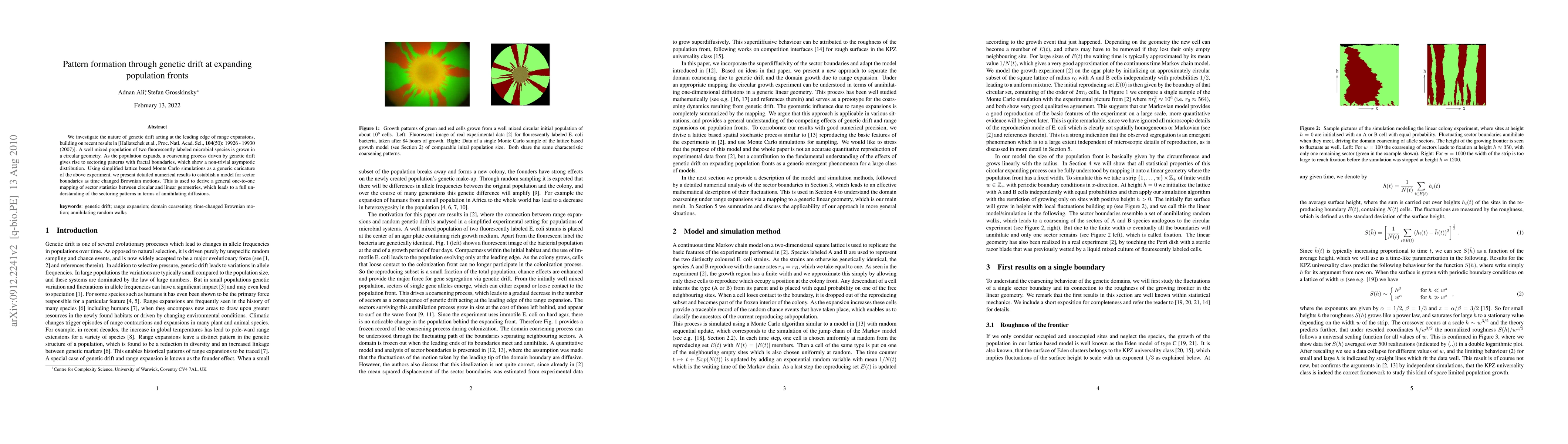 We investigate the nature of genetic drift acting at the leading edge of range expansions, building on recent results in [Hallatschek et al., Proc.\ Natl.\ Acad.\ Sci., \textbf{104}(50): 19926 - 19930 (2007)]. A well mixed population of two fluorescently labeled microbial species is grown in a circular geometry. As the population expands, a coarsening process driven by genetic drift gives rise to sectoring patterns with fractal boundaries, which show a non-trivial asymptotic distribution. Using simplified lattice based Monte Carlo simulations as a generic caricature of the above experiment, we present detailed numerical results to establish a model for sector boundaries as time changed Brownian motions. This is used to derive a general one-to-one mapping of sector statistics between circular and linear geometries, which leads to a full understanding of the sectoring patterns in terms of annihilating diffusions.