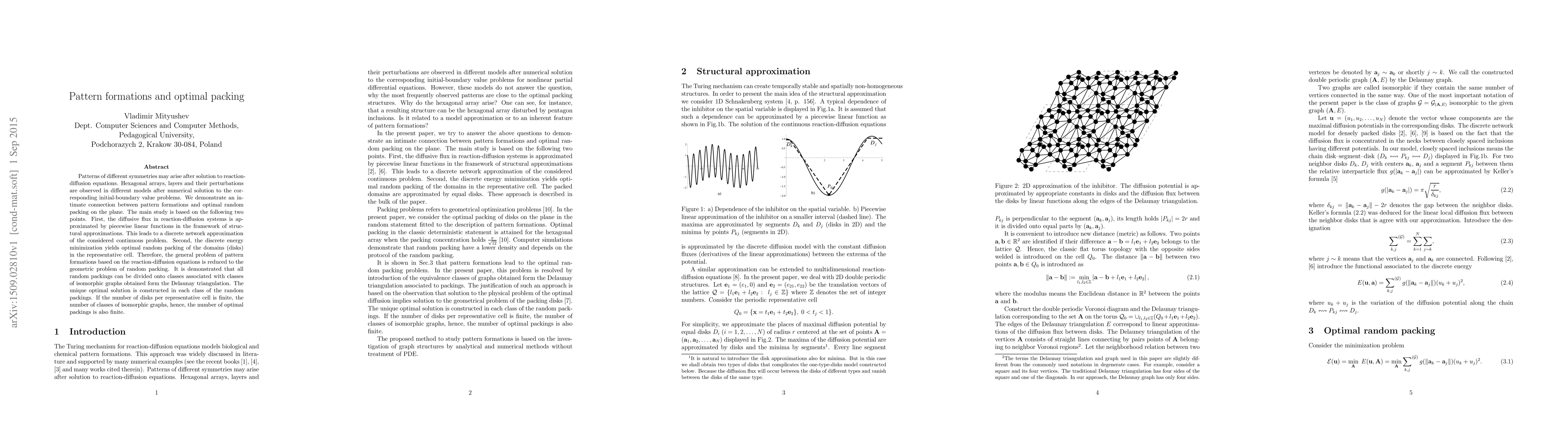 Patterns of different symmetries may arise after solution to reaction-diffusion equations. Hexagonal arrays, layers and their perturbations are observed in different models after numerical solution to the corresponding initial-boundary value problems. We demonstrate an intimate connection between pattern formations and optimal random packing on the plane. The main study is based on the following two points. First, the diffusive flux in reaction-diffusion systems is approximated by piecewise linear functions in the framework of structural approximations. This leads to a discrete network approximation of the considered continuous problem. Second, the discrete energy minimization yields optimal random packing of the domains (disks) in the representative cell. Therefore, the general problem of pattern formations based on the reaction-diffusion equations is reduced to the geometric problem of random packing. It is demonstrated that all random packings can be divided onto classes associated with classes of isomorphic graphs obtained form the Delaunay triangulation. The unique optimal solution is constructed in each class of the random packings. If the number of disks per representative cell is finite, the number of classes of isomorphic graphs, hence, the number of optimal packings is also finite.