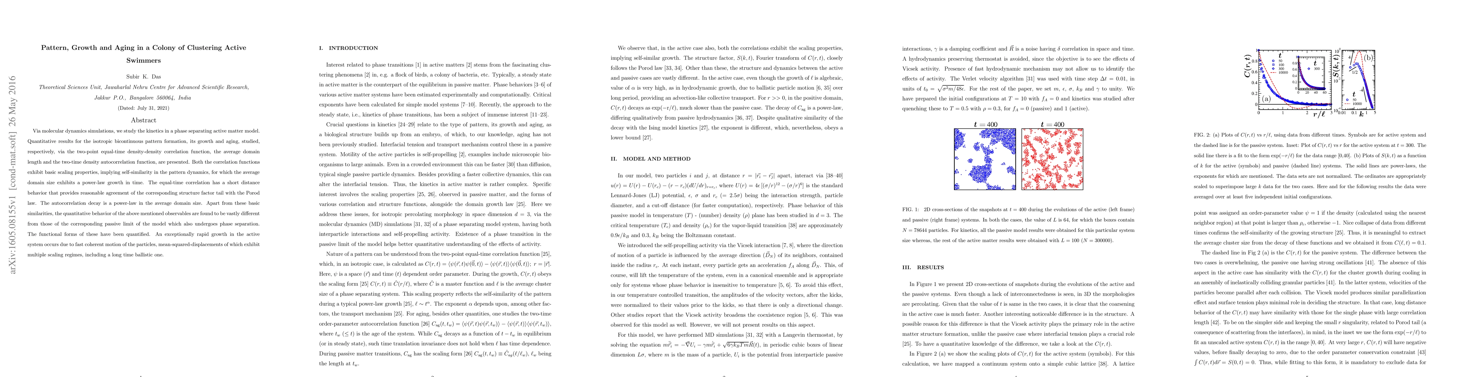 Via molecular dynamics simulations, we study the kinetics in a phase separating active matter model. Quantitative results for the isotropic bicontinuous pattern formation, its growth and aging, studied, respectively, via the two-point equal-time density-density correlation function, the average domain length and the two-time density autocorrelation function, are presented. Both the correlation functions exhibit basic scaling properties, implying self-similarity in the pattern dynamics, for which the average domain size exhibits a power-law growth in time. The equal-time correlation has a short distance behavior that provides reasonable agreement of the corresponding structure factor tail with the Porod law. The autocorrelation decay is a power-law in the average domain size. Apart from these basic similarities, the quantitative behavior of the above mentioned observables are found to be vastly different from those of the corresponding passive limit of the model which also undergoes phase separation. The functional forms of these have been quantified. An exceptionally rapid growth in the active system occurs due to fast coherent motion of the particles, mean-squared-displacements of which exhibit multiple scaling regimes, including a long time ballistic one.