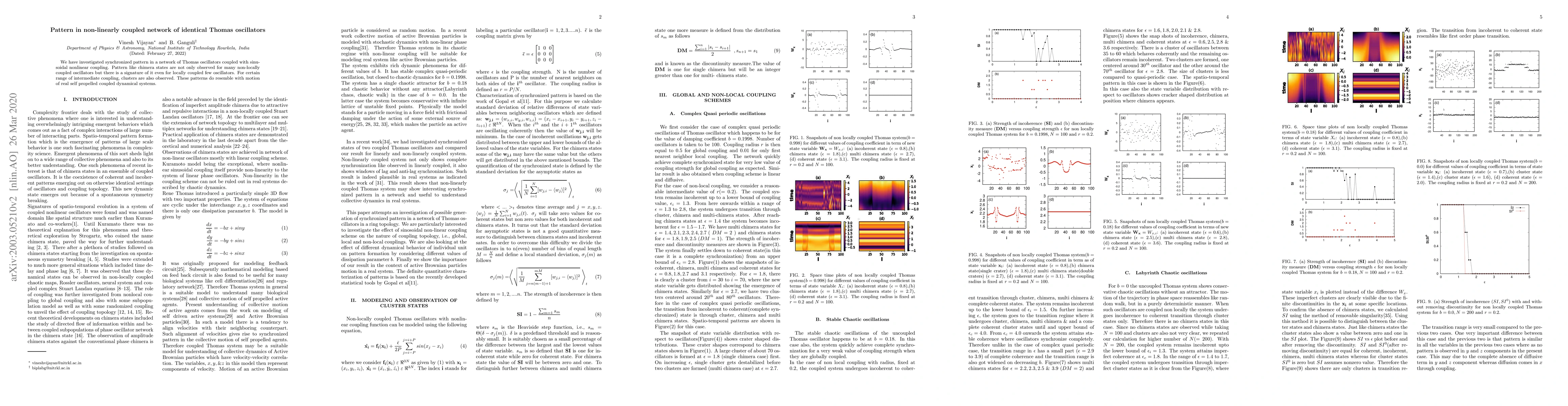 We have investigated synchronized pattern in a network of Thomas oscillators coupled with sinusoidal nonlinear coupling. Pattern like chimera states are not only observed for many non-locally coupled oscillators but there is a signature of it even for locally coupled few oscillators. For certain range of intermediate coupling, clusters are also observed. These patterns do resemble with motion of real self propelled coupled dynamical systems.