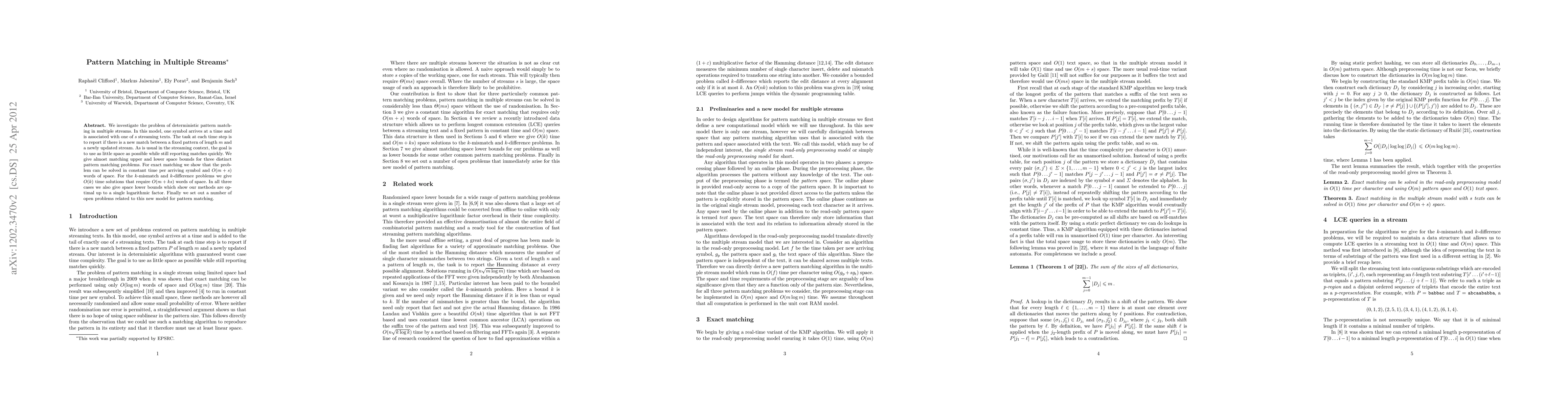 This paper explores efficient pattern matching in multiple streams, achieving optimal solutions with minimal space usage for exact matching, k-mismatch, and k-difference problems, while maintaining fast reporting times. The proposed algorithms achieve near-optimal space bounds and constant time per symbol, setting new benchmarks for this streaming context.
