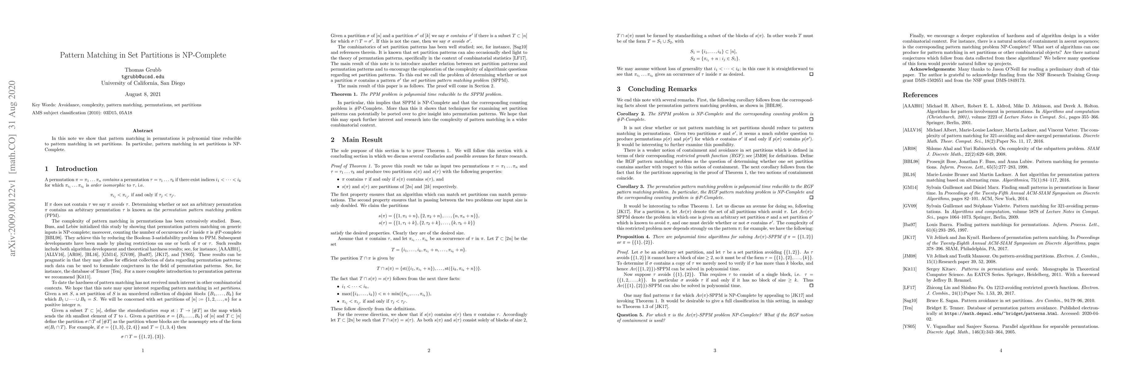 Summary: This paper demonstrates that pattern matching in permutations can be polynomially reduced to pattern matching in set partitions, establishing the latter as an NP-complete problem.
