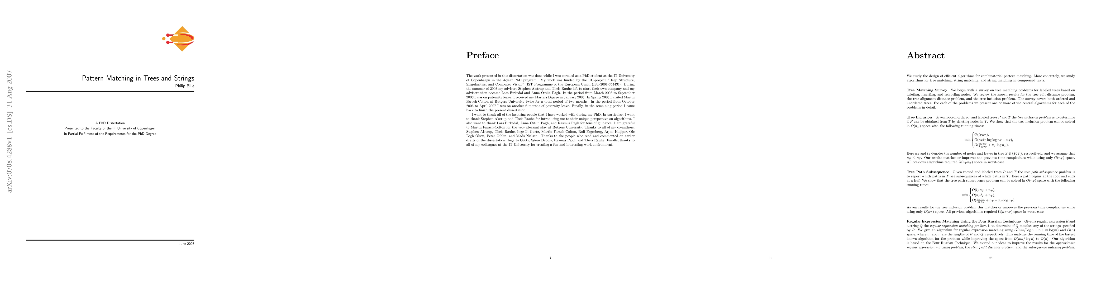 This paper investigates efficient algorithms for combinatorial pattern matching, focusing on techniques for matching patterns in trees, strings, and compressed texts. It aims to enhance the performance and scalability of these algorithms in various applications.