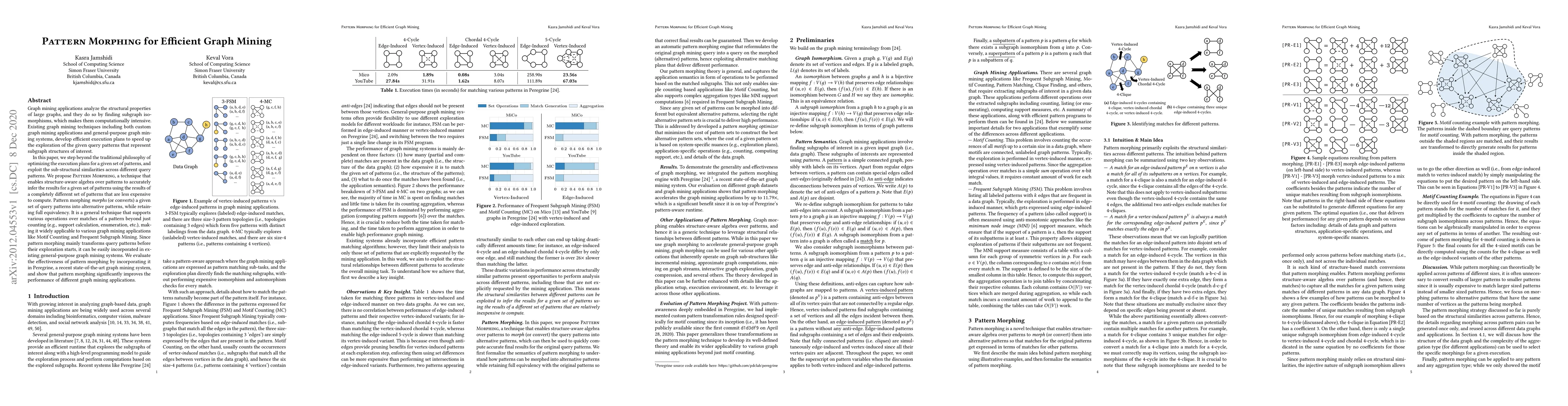 Pattern Morphing, a novel technique that morphs given query patterns into alternative patterns while maintaining equivalency, enabling structure-aware algebra over patterns for efficient graph mining applications.