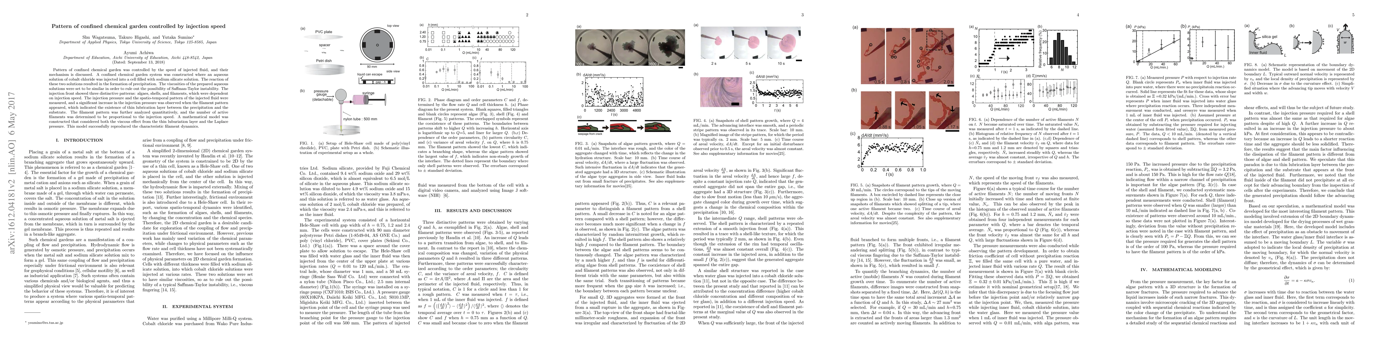 This study investigates the formation of confined chemical garden patterns controlled by the speed of injected fluid, revealing three distinctive patterns: algaes, shells, and filaments. The mathematical model incorporating viscous effects and Laplace pressure accurately reproduces the observed filament dynamics, correlating the number of filaments with the injection speed.