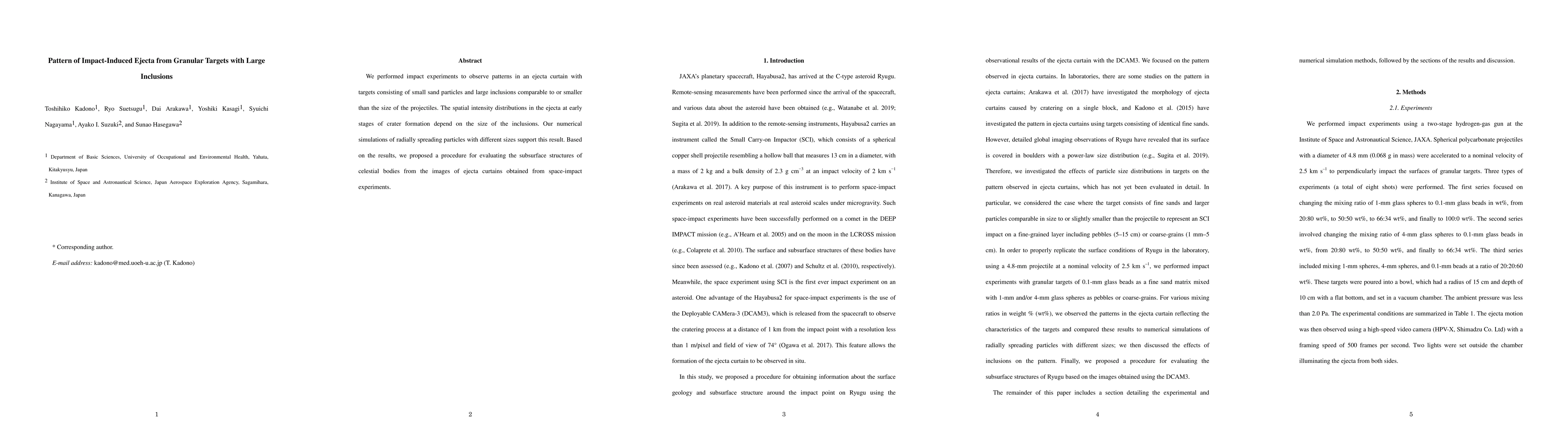 We performed impact experiments to observe patterns in an ejecta curtain with targets consisting of small sand particles and large inclusions comparable to or smaller than the size of the projectiles. The spatial intensity distributions in the ejecta at early stages of crater formation depend on the size of the inclusions. Our numerical simulations of radially spreading particles with different sizes support this result. Based on the results, we proposed a procedure for evaluating the subsurface structures of celestial bodies from the images of ejecta curtains obtained from space-impact experiments.