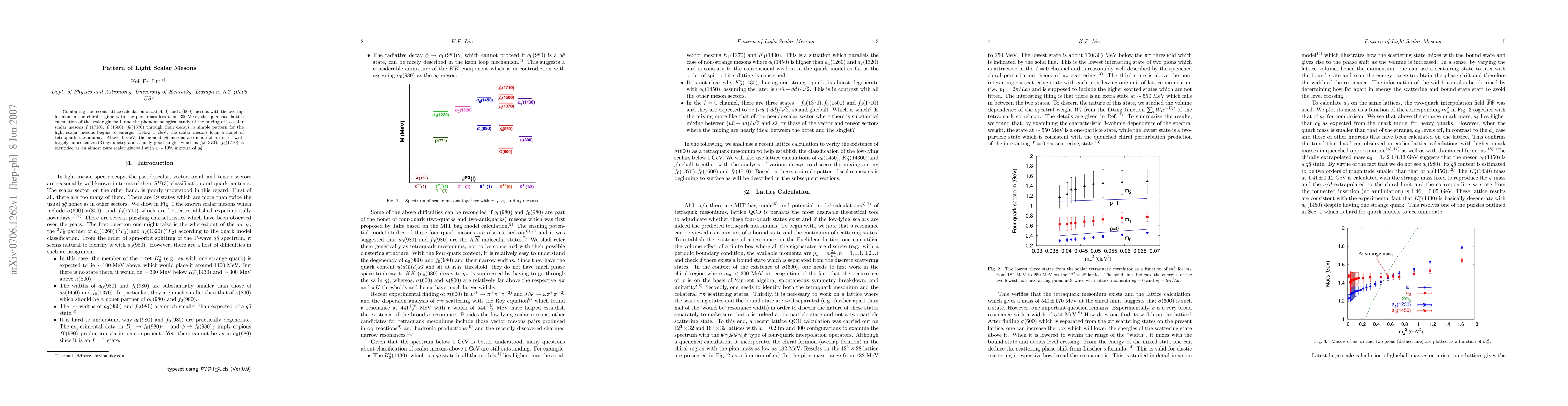 Combining the recent lattice calculation of $a_0(1450)$ and $\sigma(600)$ mesons with the overlap fermion in the chiral regime with the pion mass less than $300 {\rm MeV}$, the quenched lattice calculation of the scalar glueball, and the phenomenological study of the mixing of isoscalar scalar mesons $f_0(1710)$, $f_0(1500)$, $f_0(1370)$ through their decays, a simple pattern for the light scalar mesons begins to emerge. Below 1 GeV, the scalar mesons form a nonet of tetraquark mesoniums. Above 1 GeV, the nonent $q\bar{q}$ mesons are made of an octet with largely unbroken SU(3) symmetry and a fairly good singlet which is $f_0(1370)$. $f_0(1710)$ is identified as an almost pure scalar glueball with a $\sim 10%$ mixture of $q\bar{q}$.