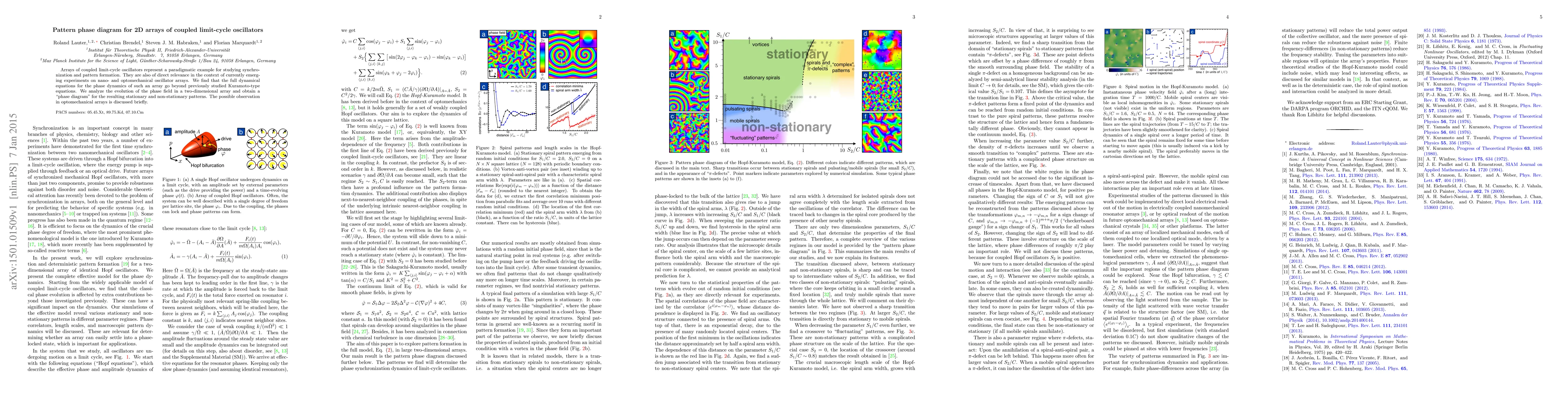This paper explores the synchronization and pattern formation in 2D arrays of coupled limit-cycle oscillators, extending beyond Kuramoto-type models. It presents a phase diagram for the array's stationary and non-stationary patterns, with implications for emerging optomechanical oscillator experiments.