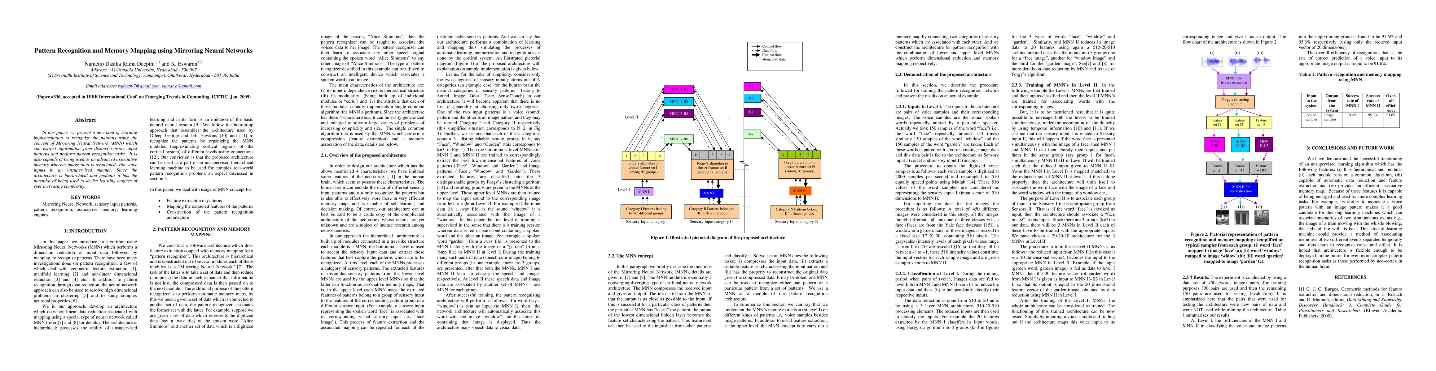 In this paper, we present a new kind of learning implementation to recognize the patterns using the concept of Mirroring Neural Network (MNN) which can extract information from distinct sensory input patterns and perform pattern recognition tasks. It is also capable of being used as an advanced associative memory wherein image data is associated with voice inputs in an unsupervised manner. Since the architecture is hierarchical and modular it has the potential of being used to devise learning engines of ever increasing complexity.