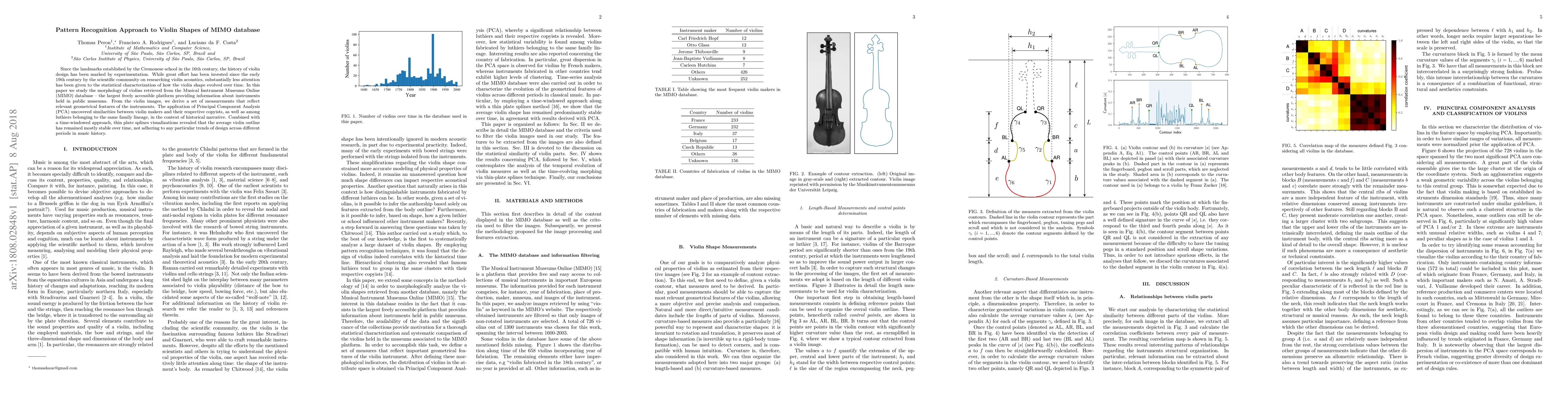 This paper employs pattern recognition techniques to analyze the morphological evolution of violins from the MIMO database, revealing similarities among violin makers and their copyists using Principal Component Analysis. Despite historical experimentation, the study finds that the average violin outline has remained stable over time, with no dominant design trends.