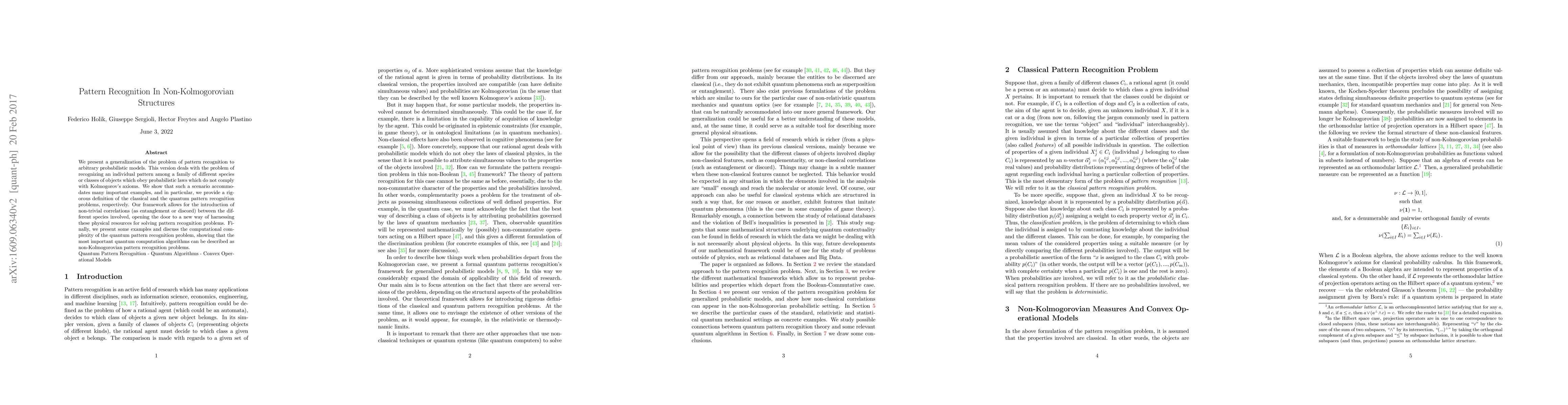 This paper generalizes pattern recognition to probabilistic models that do not adhere to Kolmogorov's axioms, introducing non-trivial correlations like entanglement for solving pattern recognition problems. It also discusses the computational complexity of quantum pattern recognition, showing that key quantum algorithms can be framed as non-Kolmogorovian pattern recognition tasks.