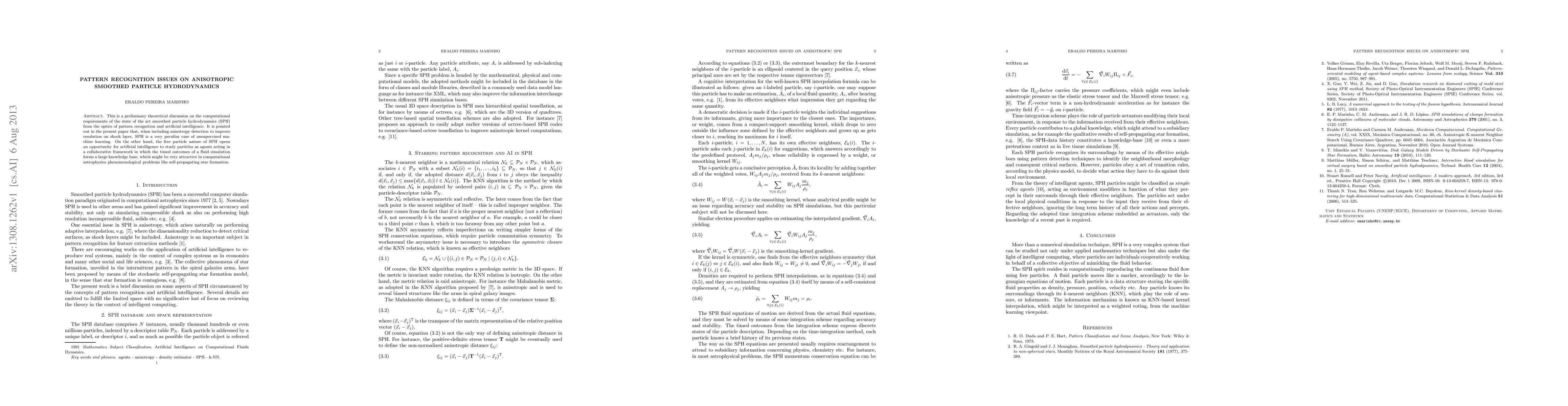 This is a preliminary theoretical discussion on the computational requirements of the state of the art smoothed particle hydrodynamics (SPH) from the optics of pattern recognition and artificial intelligence. It is pointed out in the present paper that, when including anisotropy detection to improve resolution on shock layer, SPH is a very peculiar case of unsupervised machine learning. On the other hand, the free particle nature of SPH opens an opportunity for artificial intelligence to study particles as agents acting in a collaborative framework in which the timed outcomes of a fluid simulation forms a large knowledge base, which might be very attractive in computational astrophysics phenomenological problems like self-propagating star formation.