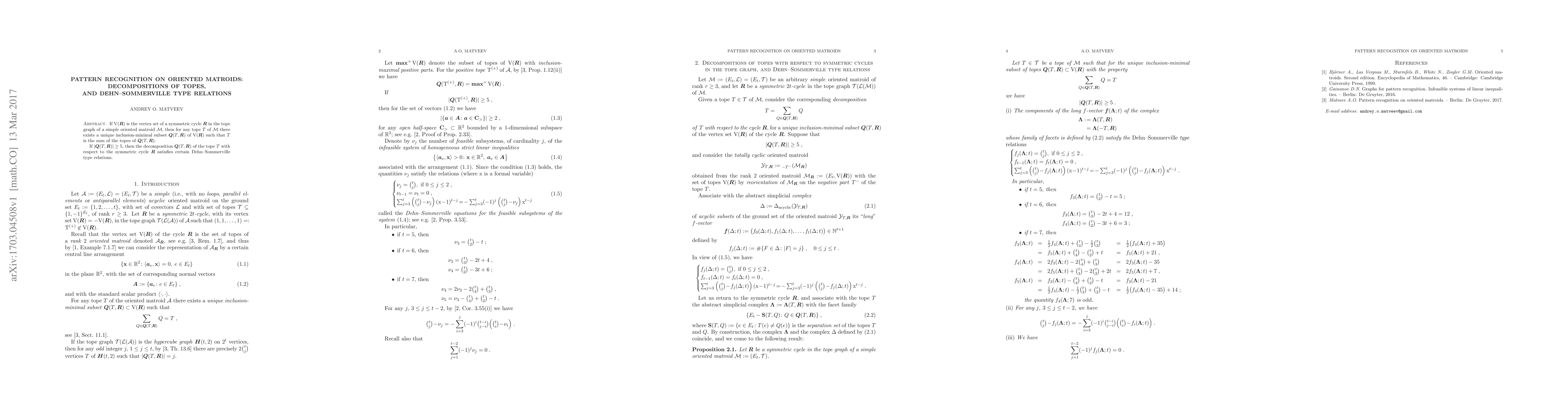 This paper explores pattern recognition in oriented matroids through tope graph decompositions, establishing a unique subset Q(T;R) that represents tope T. It further identifies Dehn-Sommerville type relations applicable when the size of Q(T;R) exceeds three.