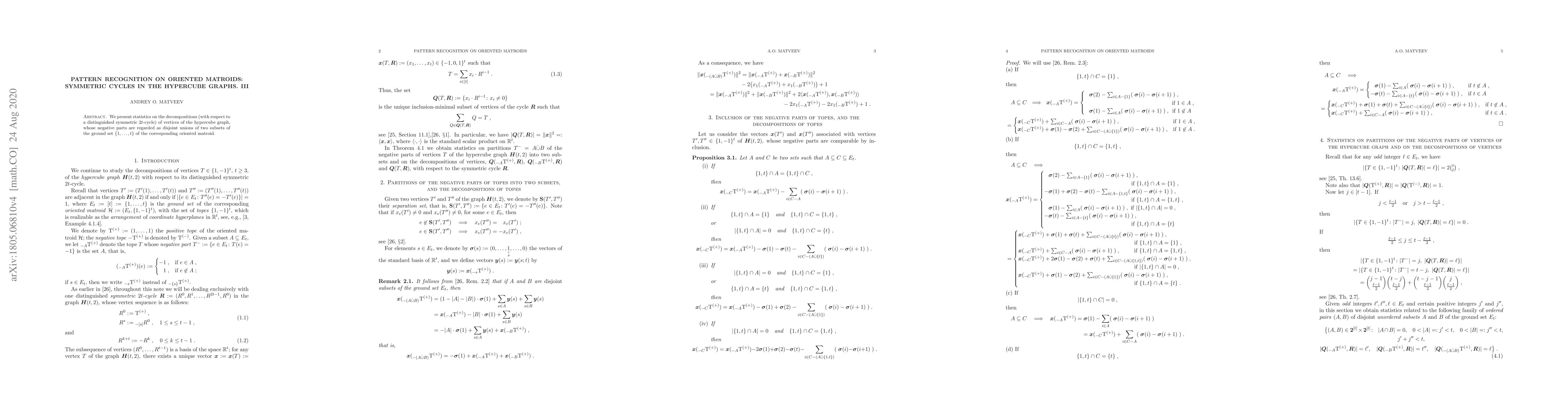 We present statistics on the decompositions (with respect to a distinguished symmetric 2t-cycle) of vertices of the hypercube graph, whose negative parts are regarded as disjoint unions of two subsets of the ground set {1,...,t} of the corresponding oriented matroid.