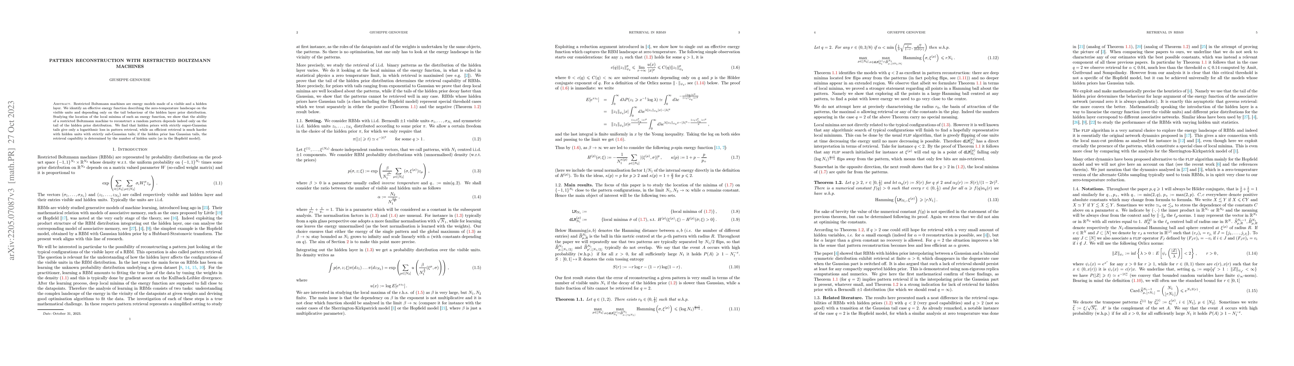 Restricted Boltzmann machines are energy models made of a visible and a hidden layer. We identify an effective energy function describing the zero-temperature landscape on the visible units and depending only on the tail behaviour of the hidden layer prior distribution. Studying the location of the local minima of such an energy function, we show that the ability of a restricted Boltzmann machine to reconstruct a random pattern depends indeed only on the tail of the hidden prior distribution. We find that hidden priors with strictly super-Gaussian tails give only a logarithmic loss in pattern retrieval, while an efficient retrieval is much harder with hidden units with strictly sub-Gaussian tails; if the hidden prior has Gaussian tails, the retrieval capability is determined by the number of hidden units (as in the Hopfield model).