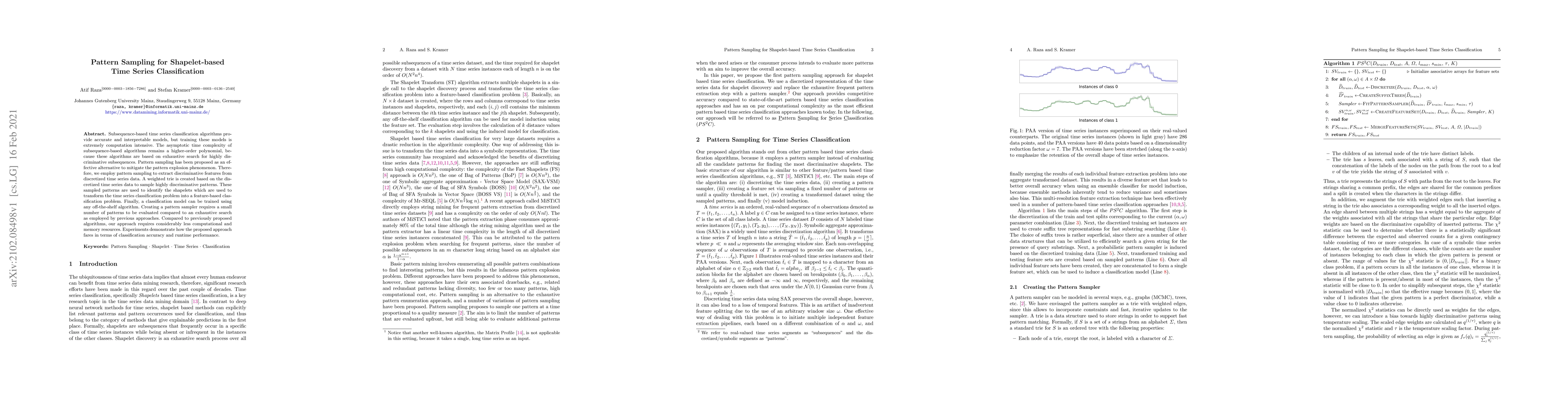 This paper proposes a pattern sampling method to extract discriminative features from discretized time series data, transforming time series classification into a feature-based problem. The approach significantly reduces computational and memory resources compared to exhaustive search methods, achieving comparable classification accuracy and improved runtime performance.