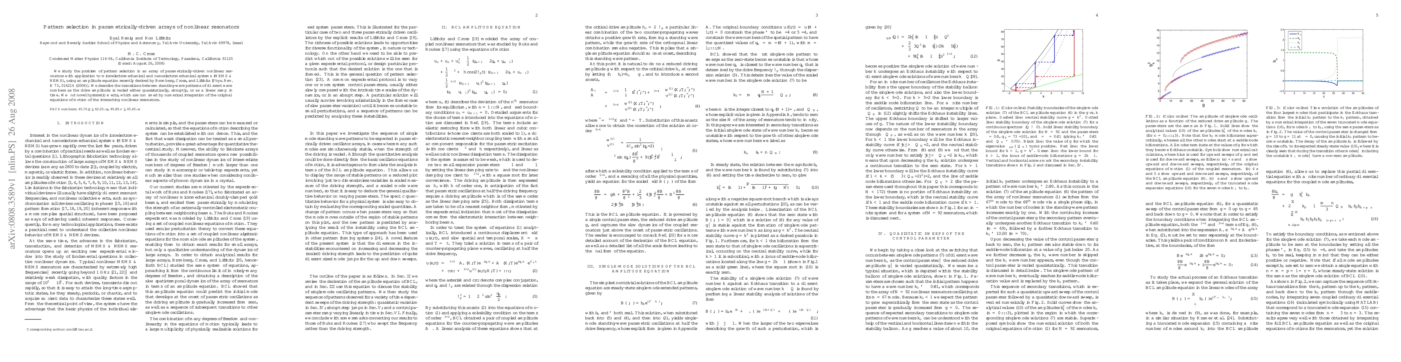 This paper investigates pattern selection in parametrically-driven arrays of nonlinear resonators, focusing on transitions between standing-wave patterns and novel hysteretic effects under different drive conditions, with implications for MEMS & NEMS technologies. Numerical simulations validate the findings based on an amplitude equation derived by Bromberg, Cross, and Lifshitz.