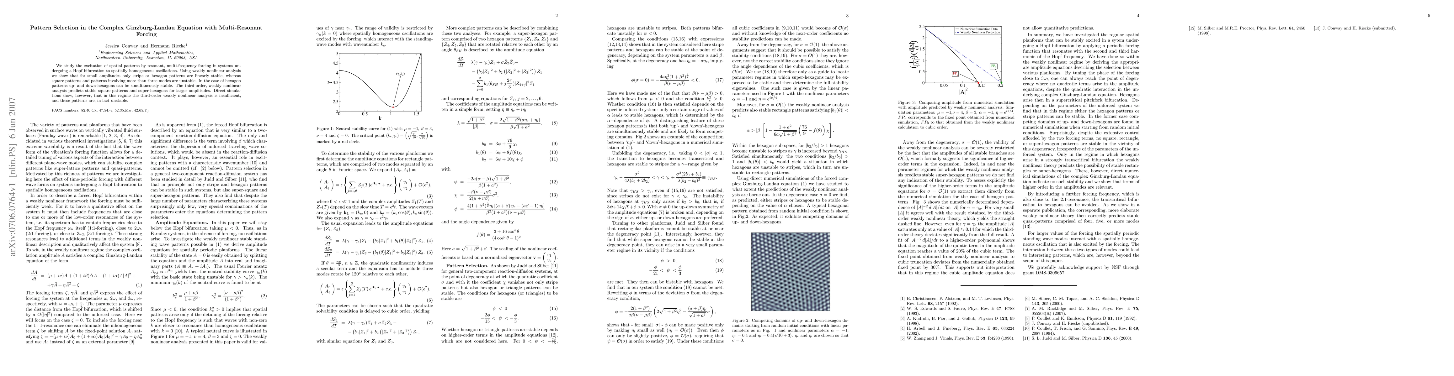 This paper investigates the formation of spatial patterns in systems undergoing Hopf bifurcation under multi-resonant forcing, revealing that only stripe or hexagon patterns are linearly stable at small amplitudes. Higher-order analysis predicts stable square and super-hexagon patterns at larger amplitudes, but simulations show these patterns are unstable in practice.