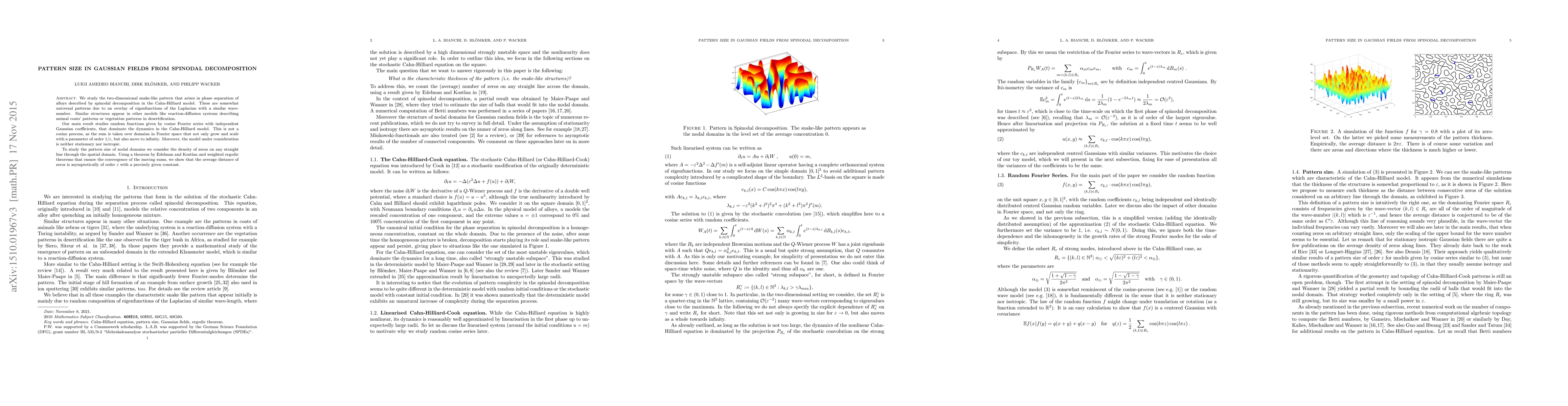 We study the two-dimensional snake-like pattern that arises in phase separation of alloys described by spinodal decomposition in the Cahn-Hilliard model. These are somewhat universal patterns due to an overlay of eigenfunctions of the Laplacian with a similar wave-number. Similar structures appear in other models like reaction-diffusion systems describing animal coats' patterns or vegetation patterns in desertification. Our main result studies random functions given by cosine Fourier series with independent Gaussian coefficients, that dominate the dynamics in the Cahn-Hilliard model. This is not a cosine process, as the sum is taken over domains in Fourier space that not only grow and scale with a parameter of order $1/\varepsilon$, but also move to infinity. Moreover, the model under consideration is neither stationary nor isotropic. To study the pattern size of nodal domains we consider the density of zeros on any straight line through the spatial domain. Using a theorem by Edelman and Kostlan and weighted ergodic theorems that ensure the convergence of the moving sums, we show that the average distance of zeros is asymptotically of order $\varepsilon$ with a precisely given constant.