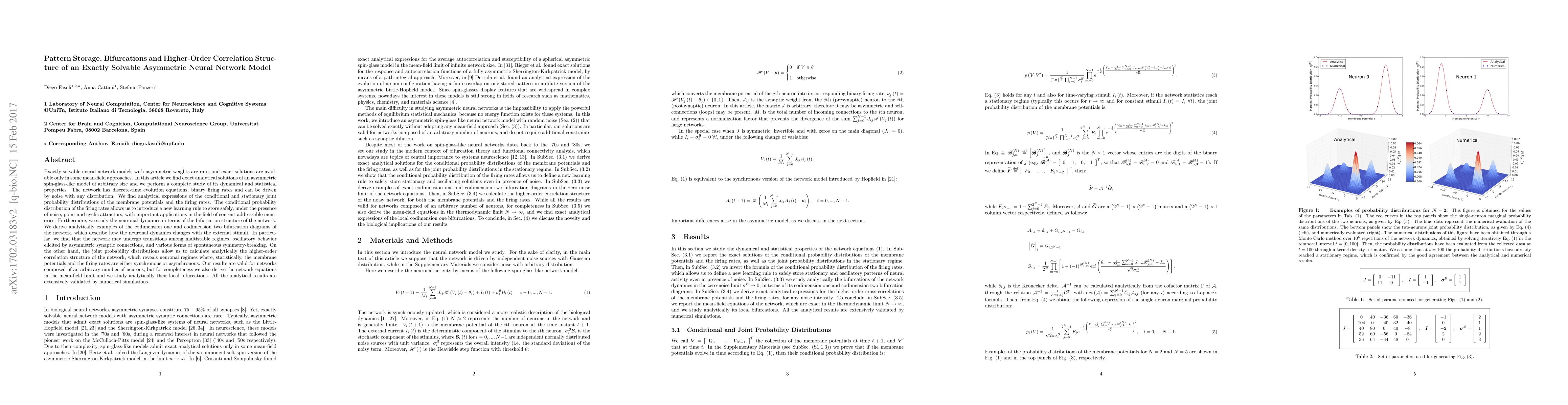 Exactly solvable neural network models with asymmetric weights are rare, and exact solutions are available only in some mean-field approaches. In this article we find exact analytical solutions of an asymmetric spin-glass-like model of arbitrary size and we perform a complete study of its dynamical and statistical properties. The network has discrete-time evolution equations, binary firing rates and can be driven by noise with any distribution. We find analytical expressions of the conditional and stationary joint probability distributions of the membrane potentials and the firing rates. The conditional probability distribution of the firing rates allows us to introduce a new learning rule to store safely, under the presence of noise, point and cyclic attractors, with important applications in the field of content-addressable memories. Furthermore, we study the neuronal dynamics in terms of the bifurcation structure of the network. We derive analytically examples of the codimension one and codimension two bifurcation diagrams of the network, which describe how the neuronal dynamics changes with the external stimuli. In particular, we find that the network may undergo transitions among multistable regimes, oscillatory behavior elicited by asymmetric synaptic connections, and various forms of spontaneous symmetry-breaking. On the other hand, the joint probability distributions allow us to calculate analytically the higher-order correlation structure of the network, which reveals neuronal regimes where, statistically, the membrane potentials and the firing rates are either synchronous or asynchronous. Our results are valid for networks composed of an arbitrary number of neurons, but for completeness we also derive the network equations in the mean-field limit and we study analytically their local bifurcations. All the analytical results are extensively validated by numerical simulations.