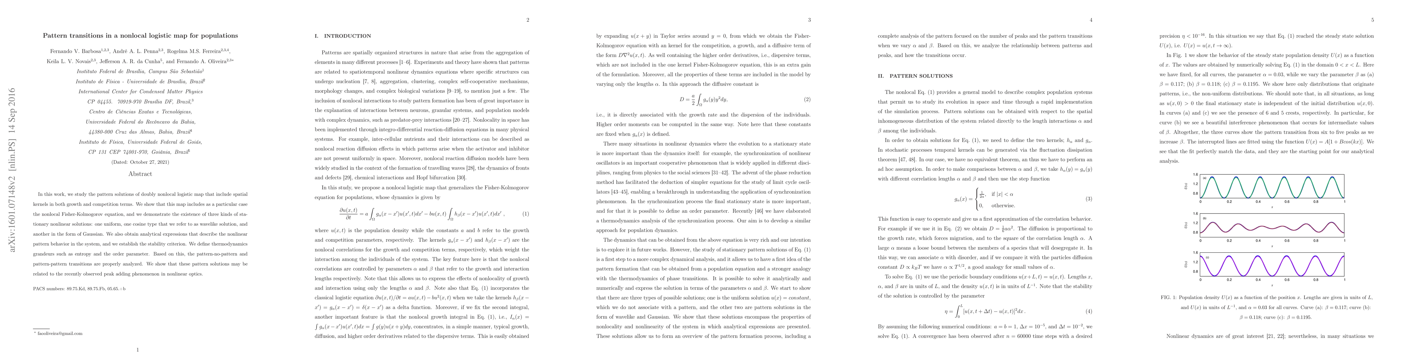 This paper studies a nonlocal logistic map for populations, discovering three types of stationary nonlinear solutions: uniform, wavelike, and Gaussian, with analytical expressions describing pattern behavior and stability criteria. The research also relates these patterns to the peak adding phenomenon in nonlinear optics.