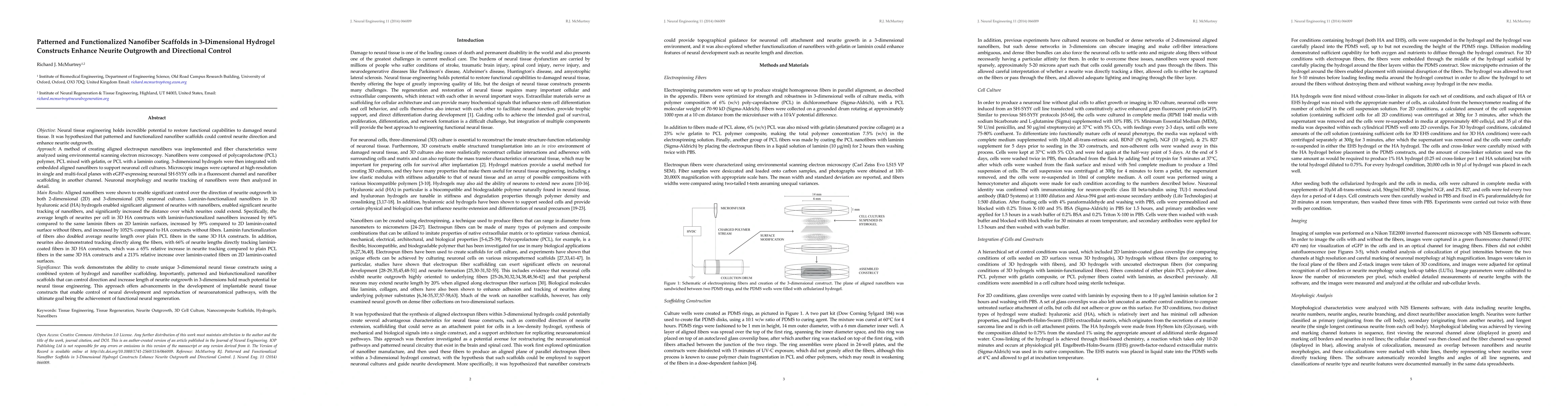 This research demonstrates that patterned and functionalized nanofiber scaffolds within 3D hydrogel constructs significantly enhance neurite outgrowth and directional control, offering promising advancements for neural tissue engineering and functional regeneration. The combination of aligned nanofibers and laminin-functionalization in hyaluronic acid hydrogels shows great potential for creating implantable neural tissue constructs.