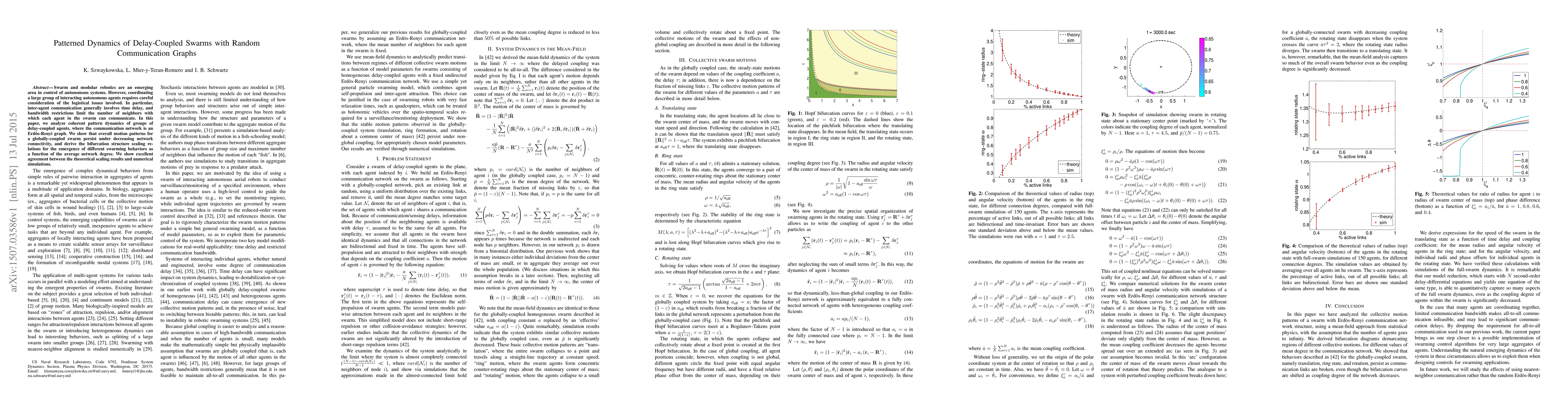 Swarm and modular robotics are an emerging area in control of autonomous systems. However, coordinating a large group of interacting autonomous agents requires careful consideration of the logistical issues involved. In particular, inter-agent communication generally involves time delay, and bandwidth restrictions limit the number of neighbors with which each agent in the swarm can communicate. In this paper, we analyze coherent pattern dynamics of groups of delay-coupled agents, where the communication network is an Erdos-Renyi graph. We show that overall motion patterns for a globally-coupled swarm persist under decreasing network connectivity, and derive the bifurcation structure scaling re- lations for the emergence of different swarming behaviors as a function of the average network degree. We show excellent agreement between the theoretical scaling results and numerical simulations.