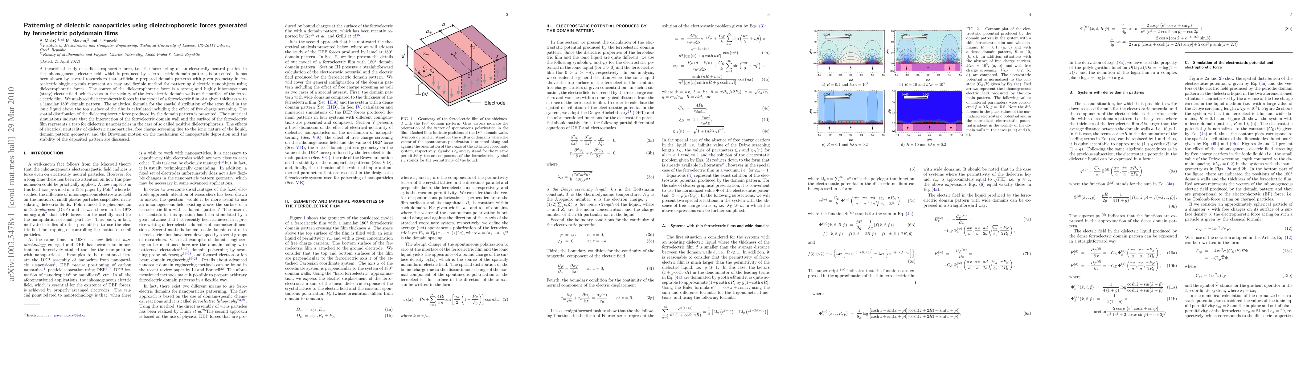 This paper presents a theoretical study on dielectrophoretic forces generated by ferroelectric domain patterns to pattern dielectric nanoparticles. The study analyzes the spatial distribution of these forces and demonstrates that the intersection of ferroelectric domain walls with the film surface acts as a trap for nanoparticles, influenced by factors like domain pattern geometry and free charge screening.