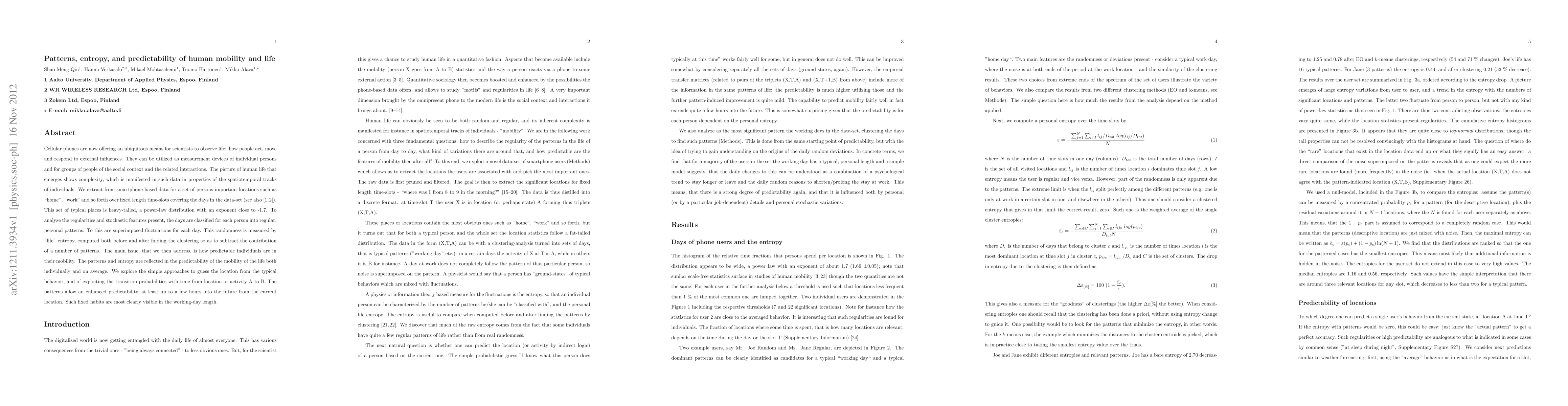Cellular phones are now offering an ubiquitous means for scientists to observe life: how people act, move and respond to external influences. They can be utilized as measurement devices of individual persons and for groups of people of the social context and the related interactions. The picture of human life that emerges shows complexity, which is manifested in such data in properties of the spatiotemporal tracks of individuals. We extract from smartphone-based data for a set of persons important locations such as "home", "work" and so forth over fixed length time-slots covering the days in the data-set. This set of typical places is heavy-tailed, a power-law distribution with an exponent close to -1.7. To analyze the regularities and stochastic features present, the days are classified for each person into regular, personal patterns. To this are superimposed fluctuations for each day. This randomness is measured by "life" entropy, computed both before and after finding the clustering so as to subtract the contribution of a number of patterns. The main issue, that we then address, is how predictable individuals are in their mobility. The patterns and entropy are reflected in the predictability of the mobility of the life both individually and on average. We explore the simple approaches to guess the location from the typical behavior, and of exploiting the transition probabilities with time from location or activity A to B. The patterns allow an enhanced predictability, at least up to a few hours into the future from the current location. Such fixed habits are most clearly visible in the working-day length.