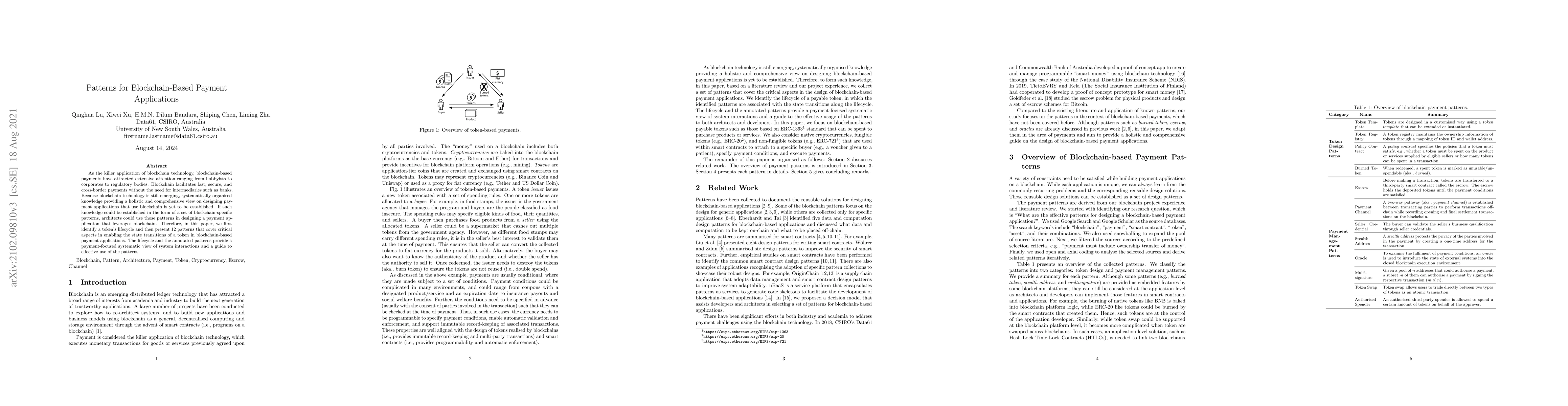 This paper identifies the lifecycle of a token and presents 12 blockchain-specific patterns to guide the design of secure, fast, and cross-border payment applications. These patterns aim to facilitate effective system interactions and state transitions in blockchain-based payment systems.