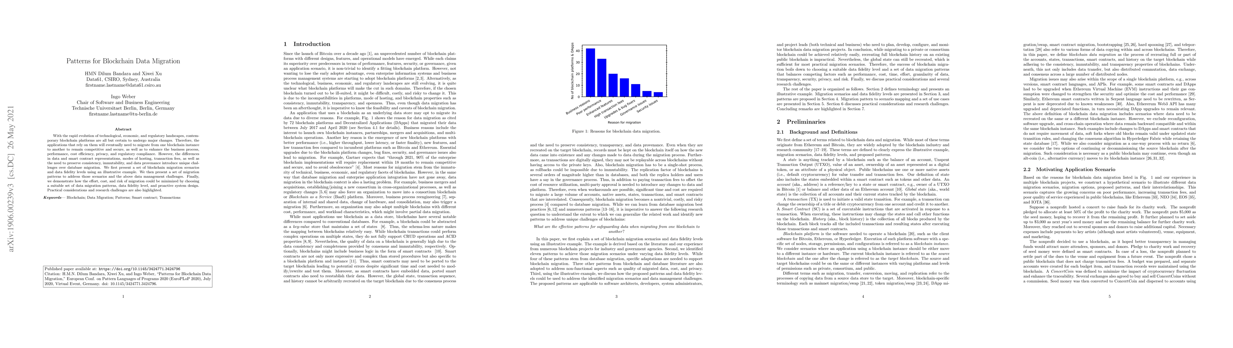 With the rapid evolution of technological, economic, and regulatory landscapes, contemporary blockchain platforms are all but certain to undergo major changes. Therefore, the applications that rely on them will eventually need to migrate from one blockchain instance to another to remain competitive and secure, as well as to enhance the business process, performance, cost efficiency, privacy, and regulatory compliance. However, the differences in data and smart contract representations, modes of hosting, transaction fees, as well as the need to preserve consistency, immutability, and data provenance introduce unique challenges over database migration. We first present a set of blockchain migration scenarios and data fidelity levels using an illustrative example. We then present a set of migration patterns to address those scenarios and the above data management challenges. Finally, we demonstrate how the effort, cost, and risk of migration could be minimized by choosing a suitable set of data migration patterns, data fidelity level, and proactive system design. Practical considerations and research challenges are also highlighted.