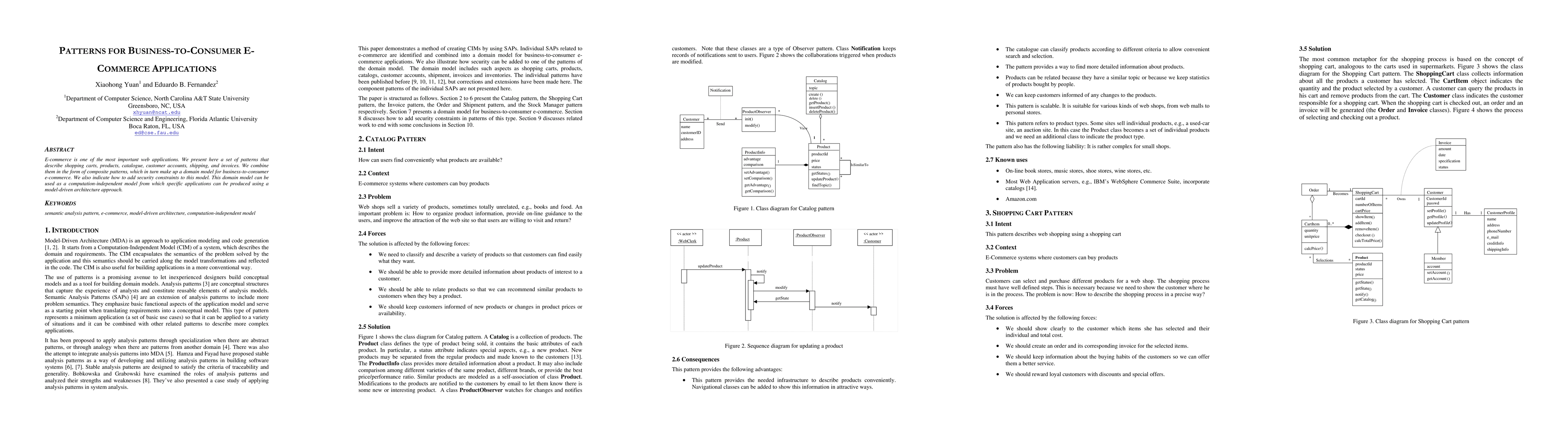E-commerce is one of the most important web applications. We present here a set of patterns that describe shopping carts, products, catalogue, customer accounts, shipping, and invoices. We combine them in the form of composite patterns, which in turn make up a domain model for business-to-consumer e-commerce. We also indicate how to add security constraints to this model. This domain model can be used as a computation-independent model from which specific applications can be produced using a model-driven architecture approach.
