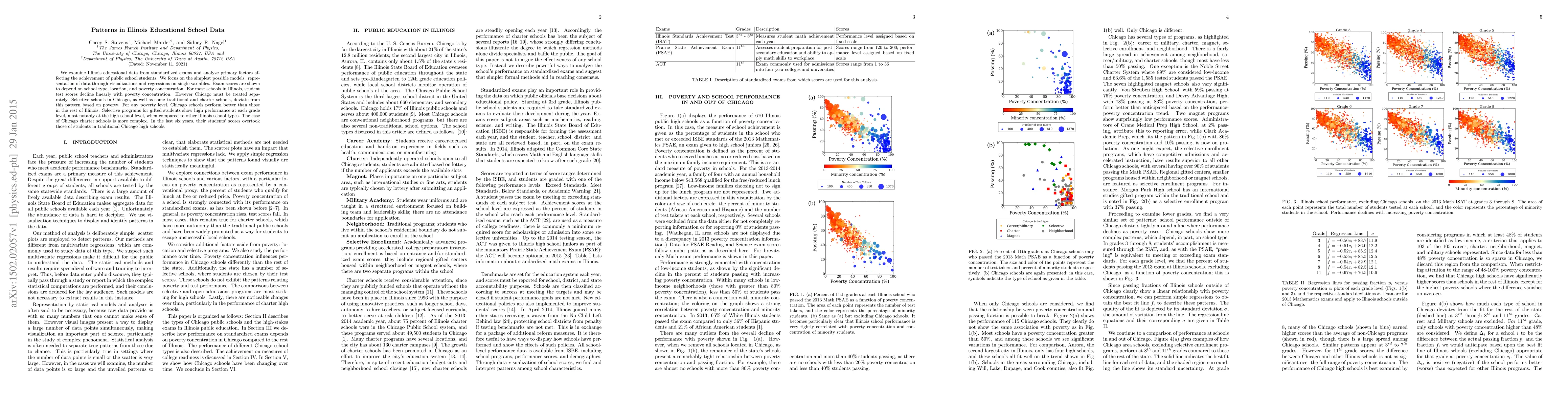 We examine Illinois educational data from standardized exams and analyze primary factors affecting the achievement of public school students. We focus on the simplest possible models: representation of data through visualizations and regressions on single variables. Exam scores are shown to depend on school type, location, and poverty concentration. For most schools in Illinois, student test scores decline linearly with poverty concentration. However Chicago must be treated separately. Selective schools in Chicago, as well as some traditional and charter schools, deviate from this pattern based on poverty. For any poverty level, Chicago schools perform better than those in the rest of Illinois. Selective programs for gifted students show high performance at each grade level, most notably at the high school level, when compared to other Illinois school types. The case of Chicago charter schools is more complex. In the last six years, their students' scores overtook those of students in traditional Chicago high schools.
