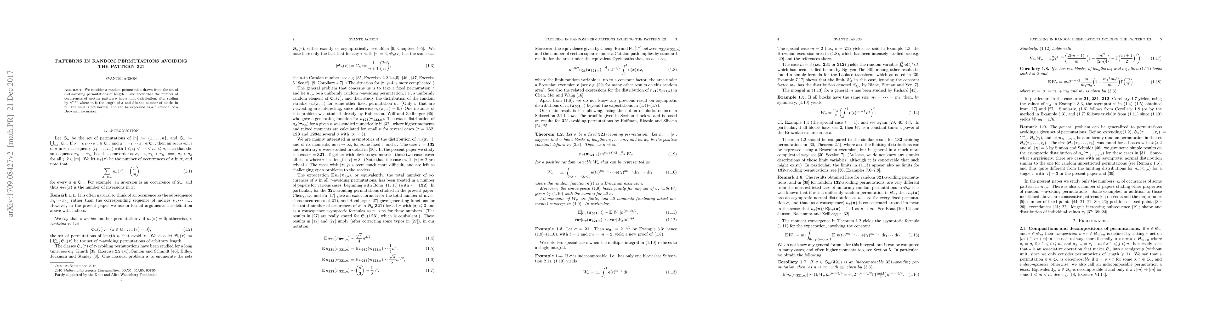 The research considers random permutations avoiding the pattern 321, demonstrating that the number of occurrences of another pattern σ scales with n, after appropriate normalization. The limiting distribution is shown to be non-normal and expressible as a functional of a Brownian excursion.
