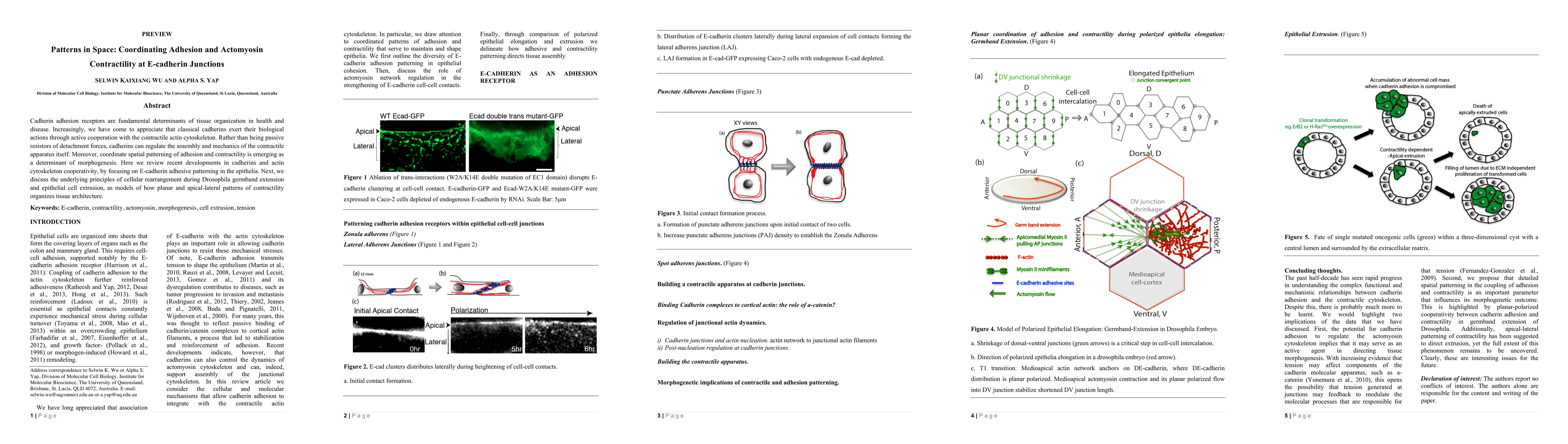 This paper reviews how E-cadherin junctions coordinate with actomyosin contractility to regulate tissue organization, emphasizing the active role of cadherins in cytoskeletal mechanics. It highlights the principles of cellular rearrangement in Drosophila germband extension and epithelial cell extrusion as models for understanding spatial patterning of adhesion and contractility in morphogenesis.