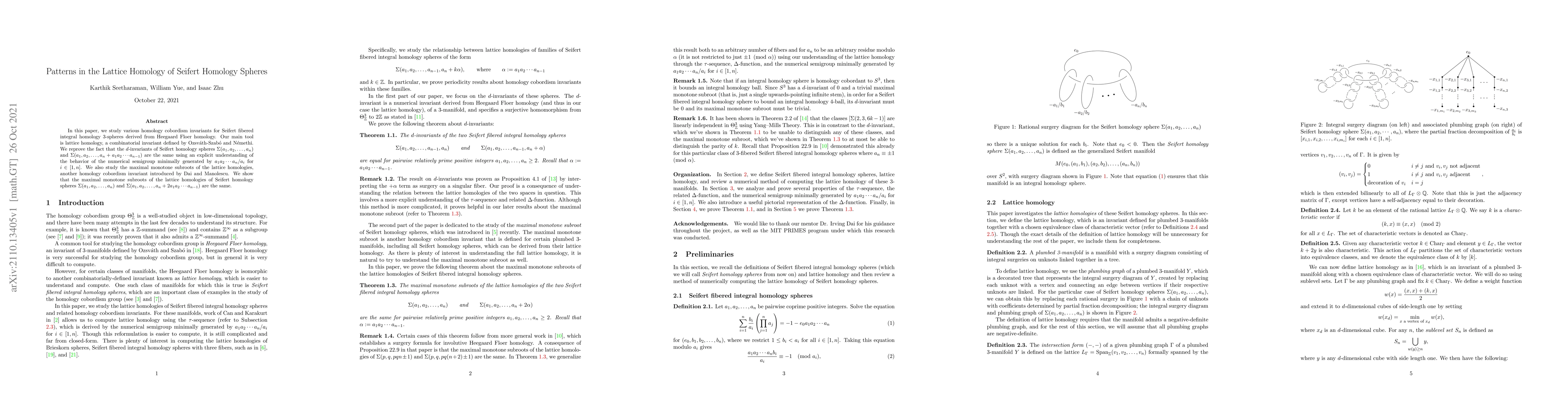 This paper investigates lattice homology invariants for Seifert fibered integral homology 3-spheres derived from Heegaard Floer homology, proving that $d$-invariants for specific Seifert spheres are equal through an analysis of generated numerical semigroups. It also demonstrates equivalence in maximal monotone subroots of lattice homologies for particular Seifert homology spheres.