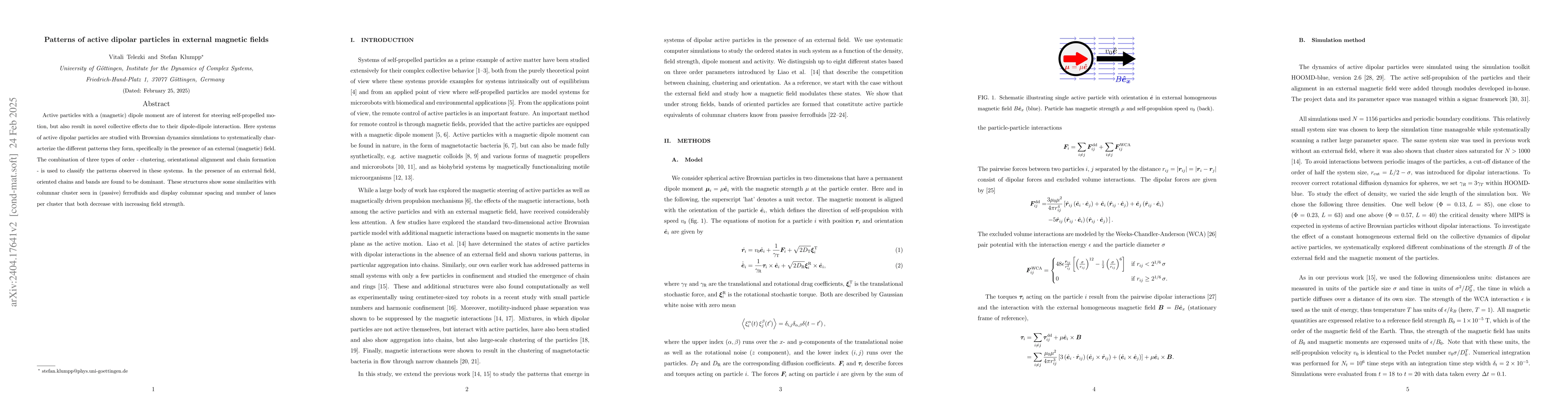 This study uses Brownian dynamics simulations to analyze patterns formed by active dipolar particles under external magnetic fields, revealing dominant oriented chains and bands. The observed structures exhibit columnar clustering, spacing, and lane numbers that decrease with stronger magnetic fields.