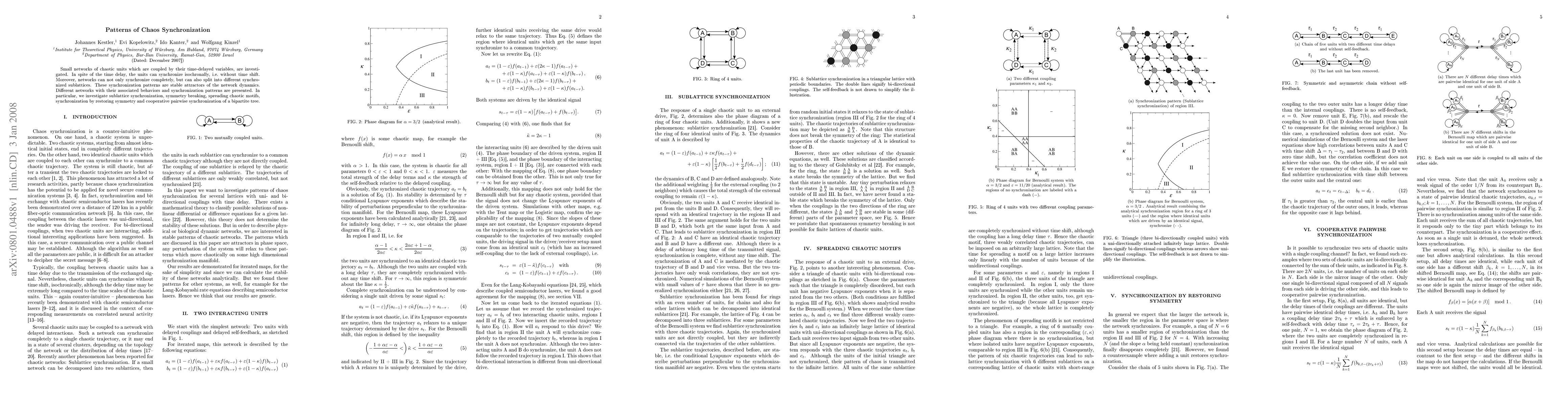 This paper explores the synchronization patterns in small networks of chaotic units connected through time-delayed variables, revealing that despite delays, units can achieve isochronal synchronization without time shifts. It also discusses the emergence of various synchronization patterns, including sublattice synchronization and symmetry breaking, which are stable attractors in network dynamics.
