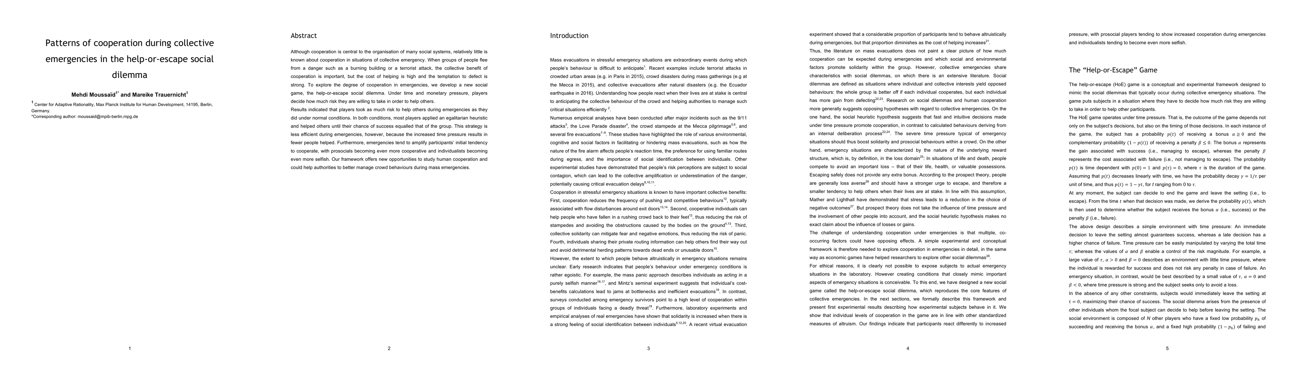 This study explores cooperation in collective emergencies using a new social game called the help-or-escape dilemma. Results show that players maintain similar levels of risk-taking to help others in emergencies as in normal conditions, though time pressure reduces the number of people helped. The study highlights how emergencies amplify participants' initial cooperative tendencies.