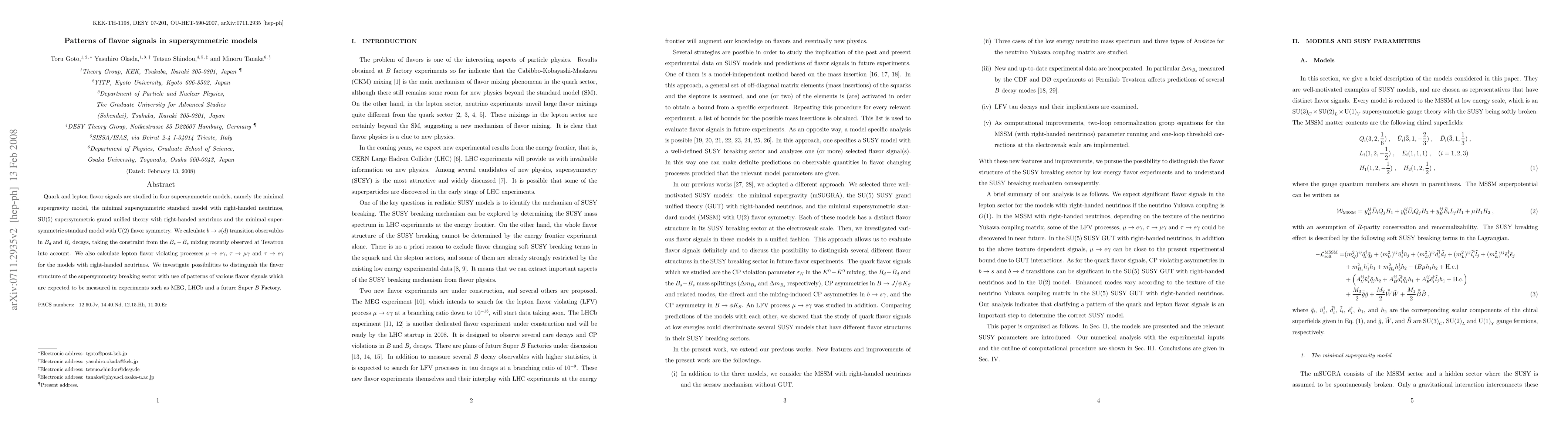 This paper examines quark and lepton flavor signals in four supersymmetric models, focusing on b --> s(d) transition observables in B decays and lepton flavor violation processes. It aims to distinguish the flavor structure of the supersymmetry breaking sector using measurable flavor signals from experiments like LHCb and a future Super B Factory.