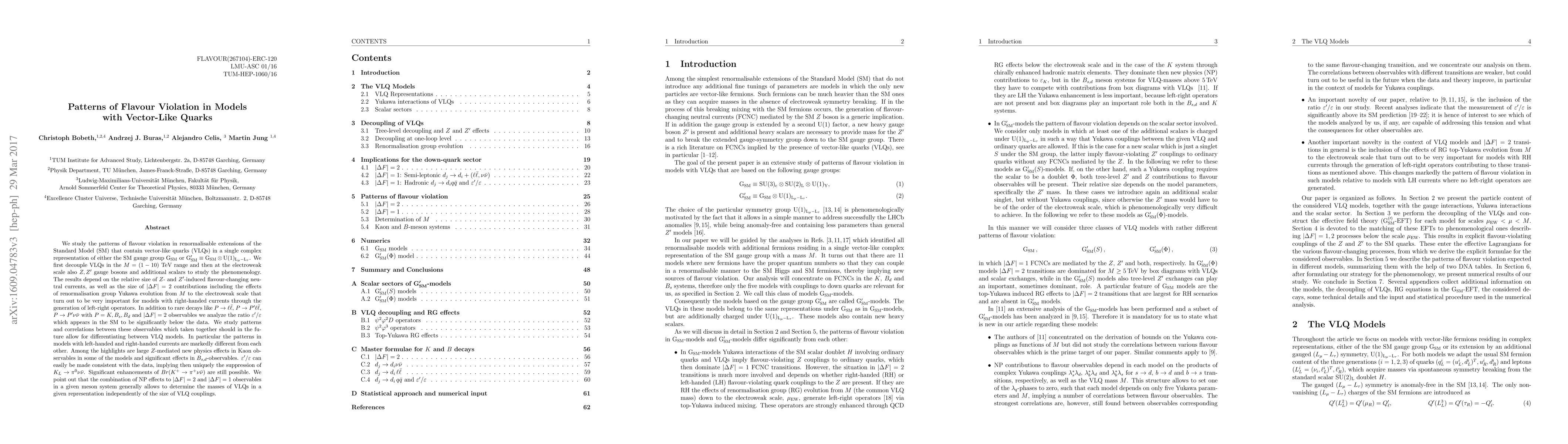 Researchers studied patterns of flavor violation in models with vector-like quarks, finding potential effects in rare decays and observables like $rac{ ext{Br}(K^+ o ext{p} uar u)}{ ext{Br}( ext{K}^+ o e^+e^-)}$ that could help differentiate between models.