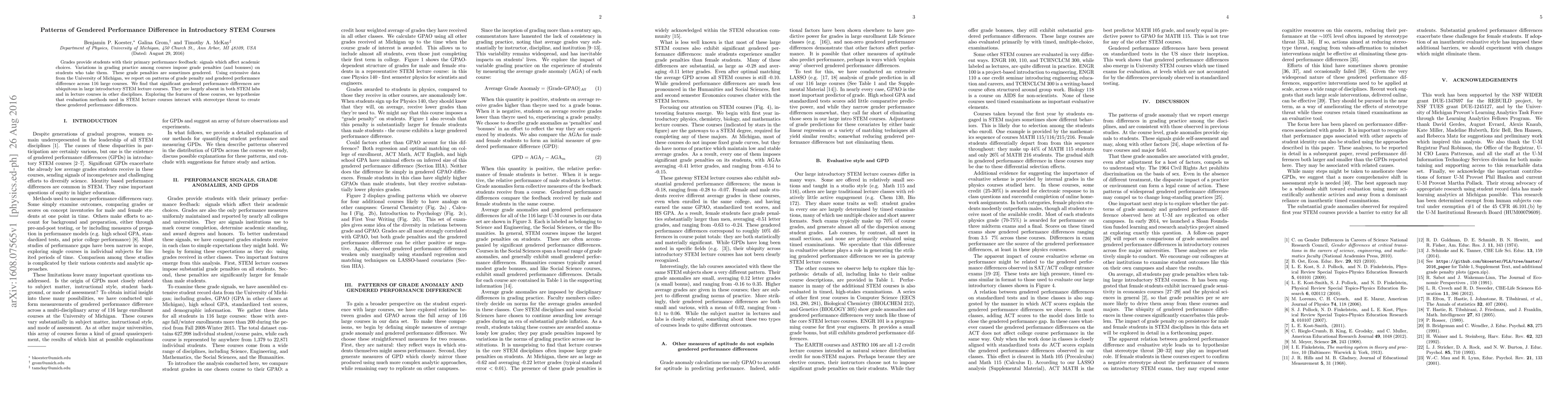 Grades provide students with their primary performance feedback: signals which affect academic choices. Variations in grading practice among courses impose grade penalties (and bonuses) on students who take them. These grade penalties are sometimes gendered. Using extensive data from the University of Michigan, we report on patterns of grade penalty and gendered performance difference across 116 large courses. We find that significant gendered performance differences are ubiquitous in large introductory STEM lecture courses. They are largely absent in both STEM labs and in lecture courses in other disciplines. Exploring the features of these courses, we hypothesize that evaluation methods used in STEM lecture courses interact with stereotype threat to create these gendered performance differences.