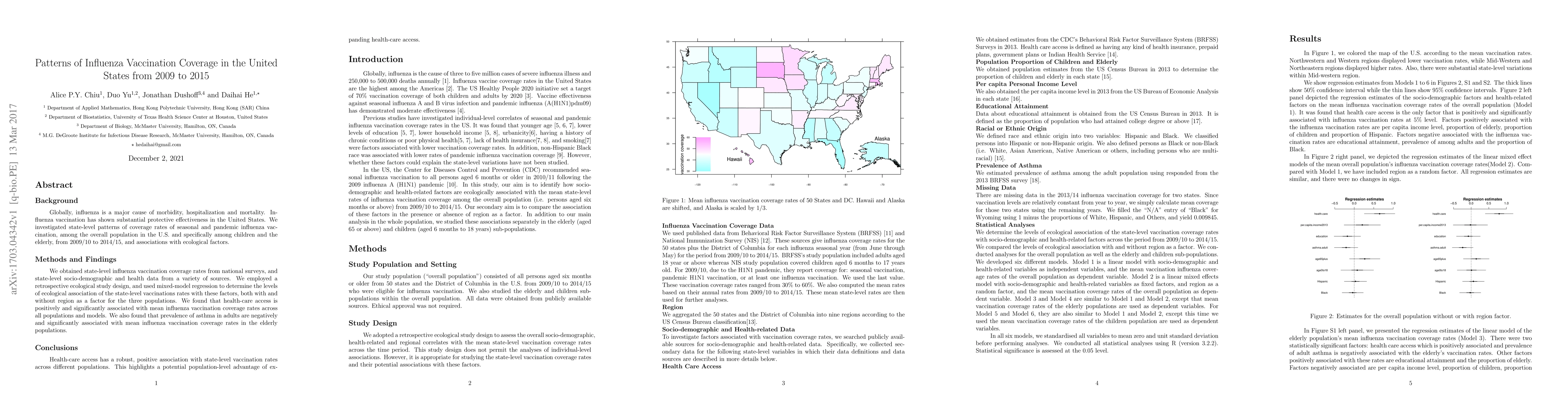 Background: Globally, influenza is a major cause of morbidity, hospitalization and mortality. Influenza vaccination has shown substantial protective effectiveness in the United States. We investigated state-level patterns of coverage rates of seasonal and pandemic influenza vaccination, among the overall population in the U.S. and specifically among children and the elderly, from 2009/10 to 2014/15, and associations with ecological factors. Methods and Findings: We obtained state-level influenza vaccination coverage rates from national surveys, and state-level socio-demographic and health data from a variety of sources. We employed a retrospective ecological study design, and used mixed-model regression to determine the levels of ecological association of the state-level vaccinations rates with these factors, both with and without region as a factor for the three populations. We found that health-care access is positively and significantly associated with mean influenza vaccination coverage rates across all populations and models. We also found that prevalence of asthma in adults are negatively and significantly associated with mean influenza vaccination coverage rates in the elderly populations. Conclusions: Health-care access has a robust, positive association with state-level vaccination rates across different populations. This highlights a potential population-level advantage of expanding health-care access.