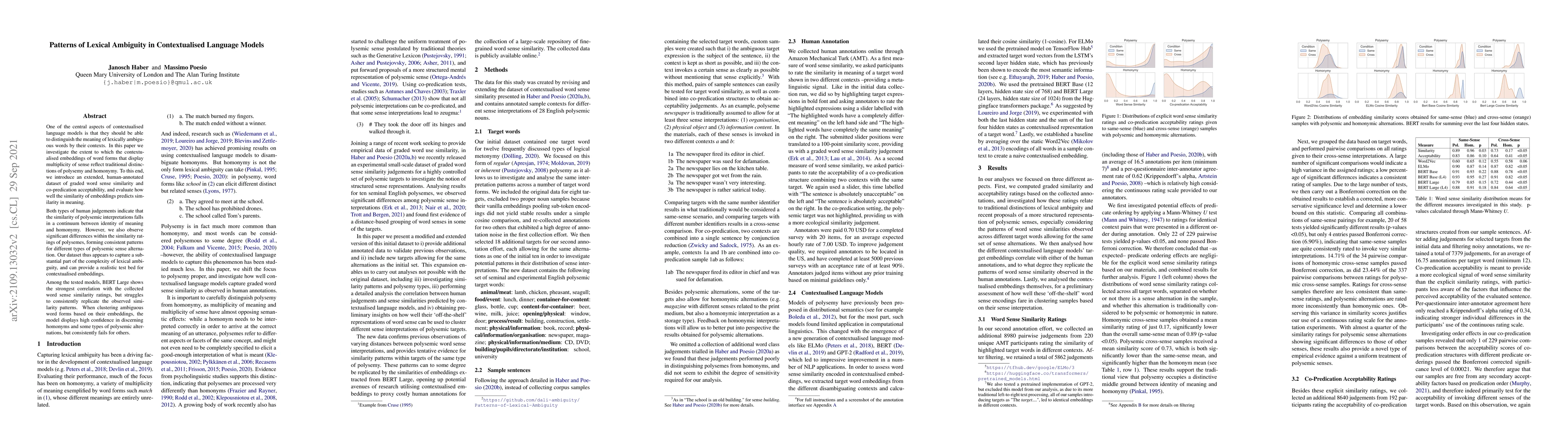 This paper examines how contextualised language models handle lexical ambiguity, finding that while models like BERT Large correlate well with human sense similarity ratings, they struggle to consistently replicate the nuanced patterns of polysemy and homonymy observed in human judgements. The study introduces a new dataset to better test these models.