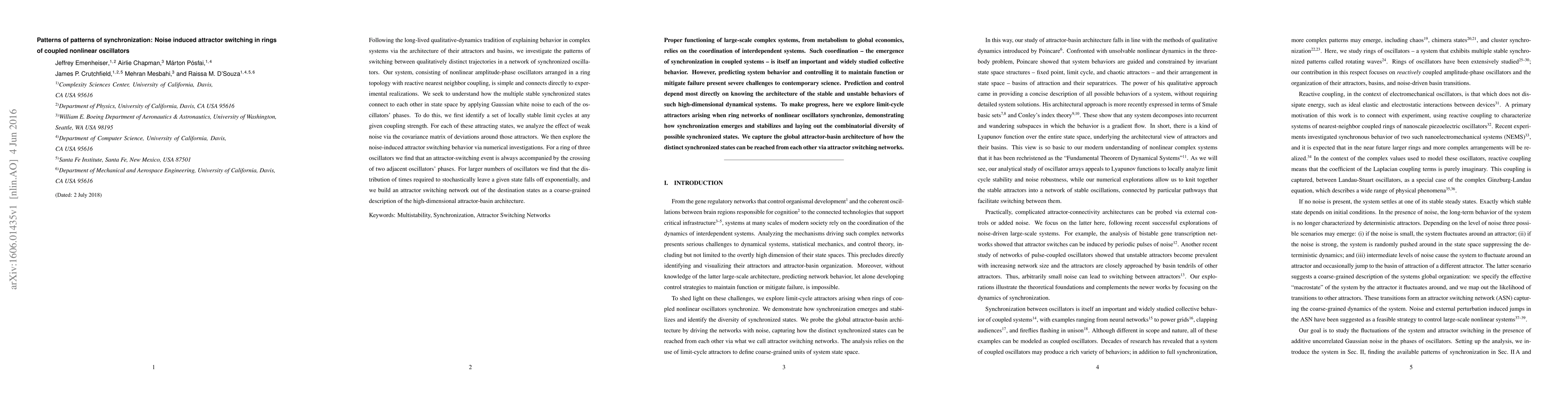 Researchers study how noise affects synchronized oscillators in a ring topology, finding that attractor switching is always accompanied by adjacent phase crossings, and for larger systems, the distribution of times to leave a state follows an exponential decay.
