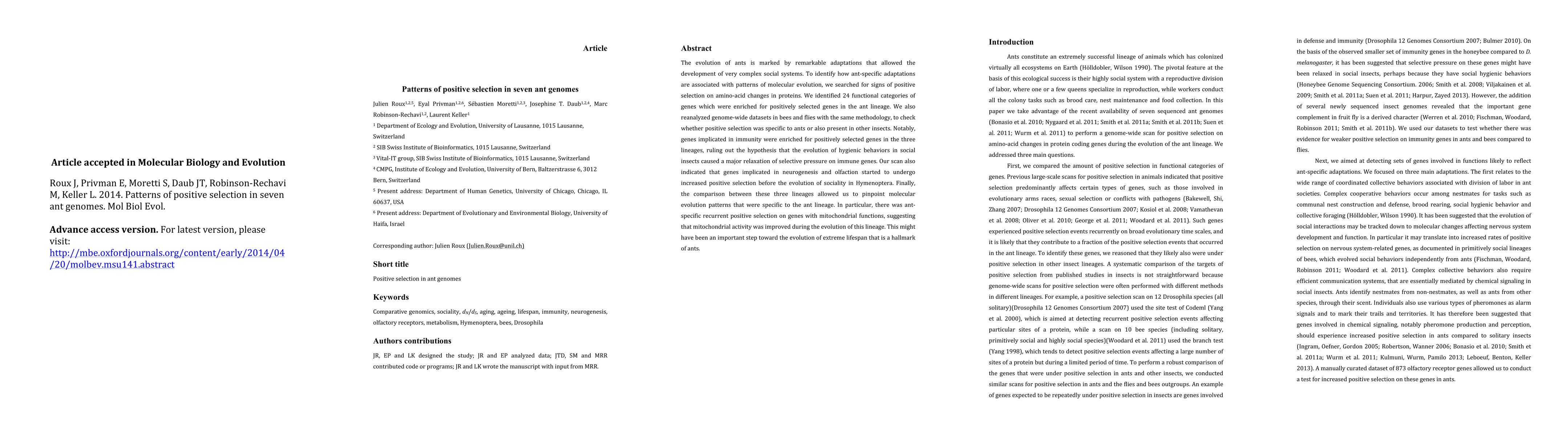 The evolution of ants is marked by remarkable adaptations that allowed the development of very complex social systems. To identify how ant-specific adaptations are associated with patterns of molecular evolution, we searched for signs of positive selection on amino-acid changes in proteins. We identified 24 functional categories of genes which were enriched for positively selected genes in the ant lineage. We also reanalyzed genome-wide datasets in bees and flies with the same methodology, to check whether positive selection was specific to ants or also present in other insects. Notably, genes implicated in immunity were enriched for positively selected genes in the three lineages, ruling out the hypothesis that the evolution of hygienic behaviors in social insects caused a major relaxation of selective pressure on immune genes. Our scan also indicated that genes implicated in neurogenesis and olfaction started to undergo increased positive selection before the evolution of sociality in Hymenoptera. Finally, the comparison between these three lineages allowed us to pinpoint molecular evolution patterns that were specific to the ant lineage. In particular, there was ant-specific recurrent positive selection on genes with mitochondrial functions, suggesting that mitochondrial activity was improved during the evolution of this lineage. This might have been an important step toward the evolution of extreme lifespan that is a hallmark of ants.