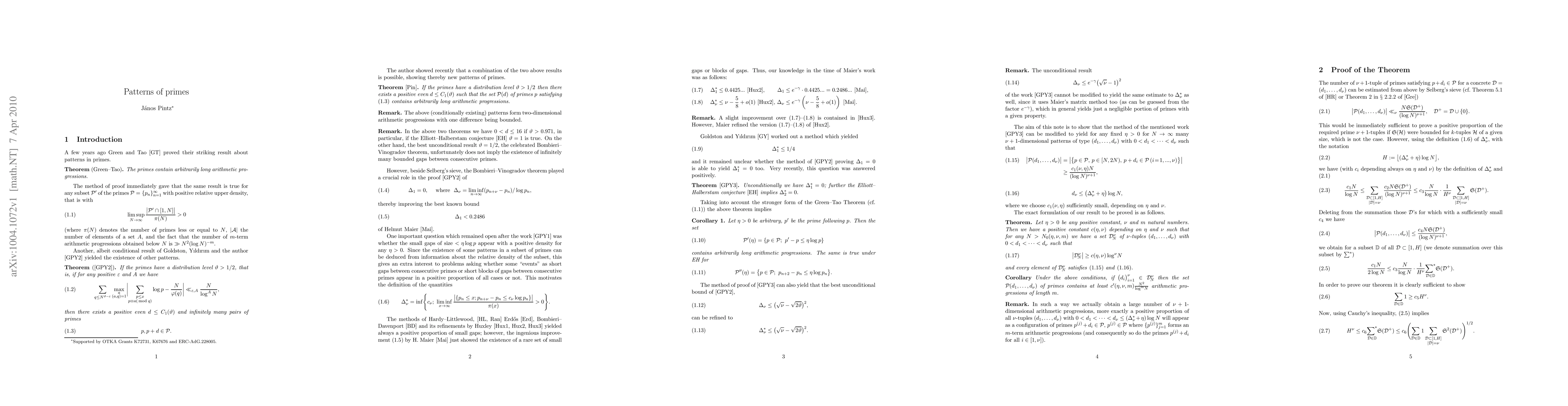 Summary: This paper demonstrates the existence of generalized prime patterns, extending the Green-Tao theorem that proves arbitrarily long arithmetic progressions within the sequence of primes. It explores more complex structures beyond simple arithmetic sequences.